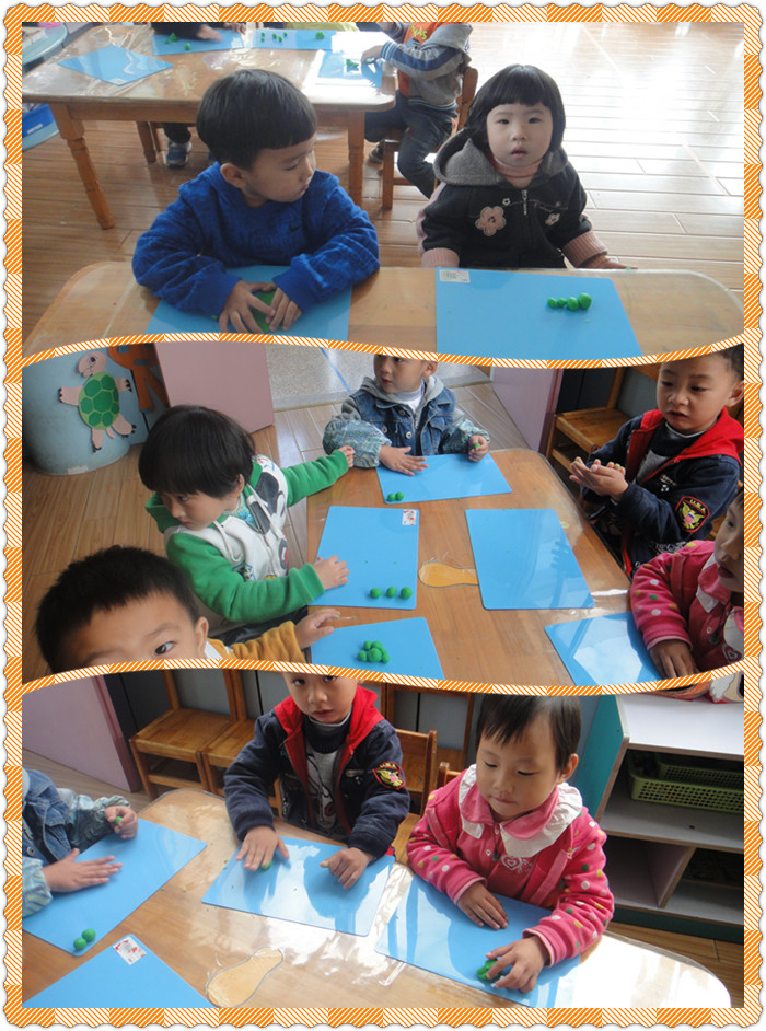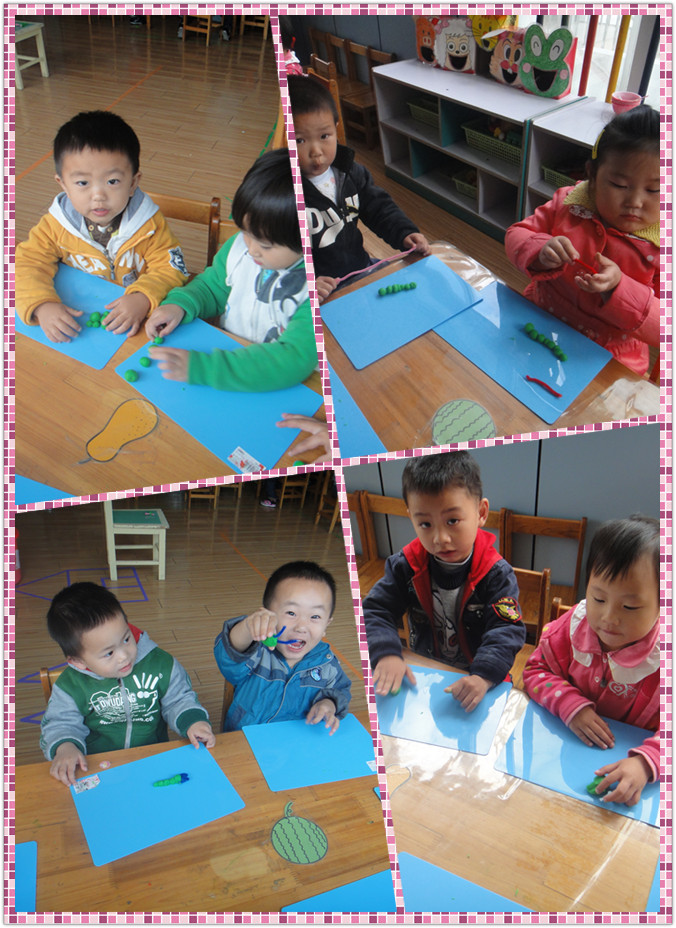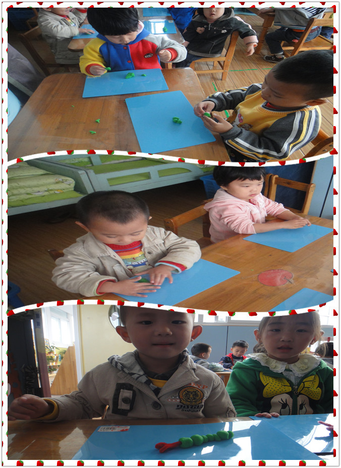 你知道我们在做什么吗?我们用的是油泥,在做毛毛虫呢?先搓几个小圆球黏在一起,用毛根做毛毛虫的触角就可以啦!