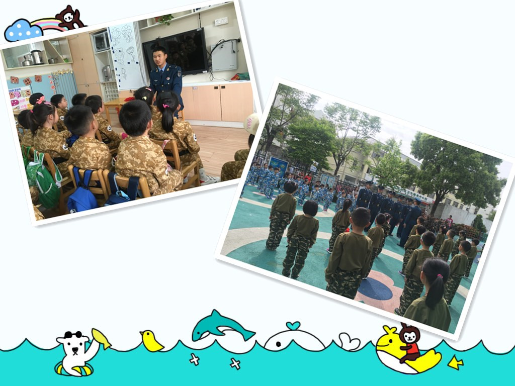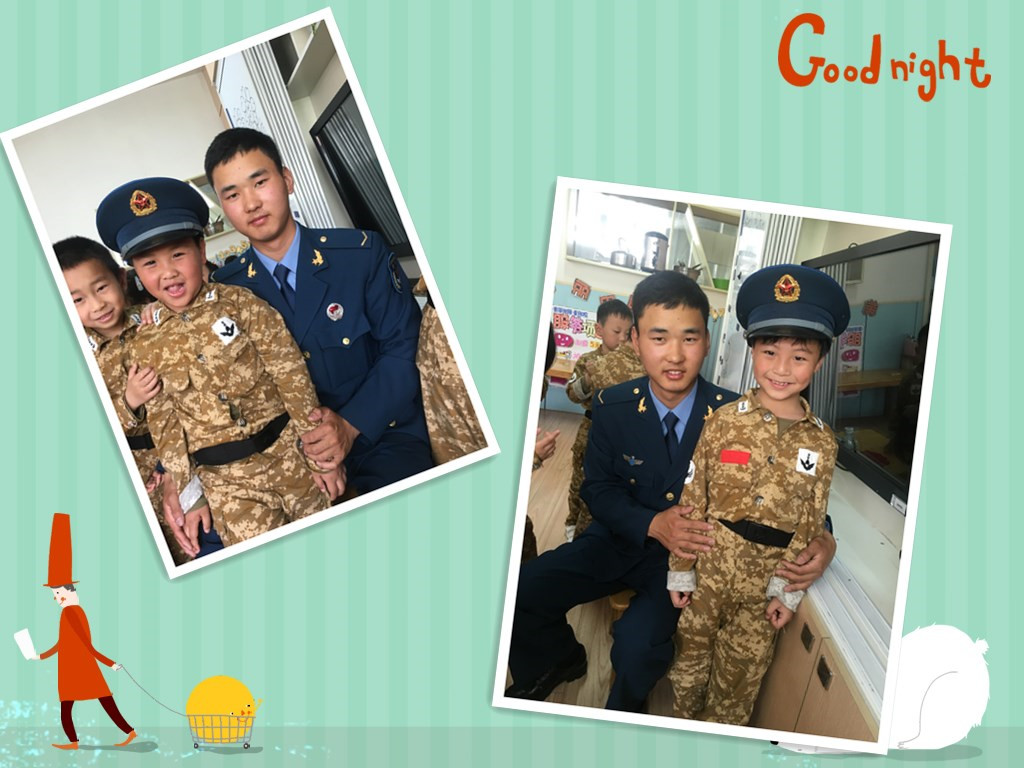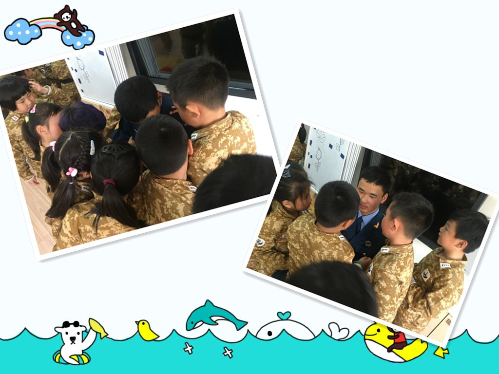 这是我们第一次和解放军叔叔们零距离接触,当老师妈妈说自主活动时我们就迫不及待的跑到解放军叔叔身边,问他刚刚没有问道的问题。比如我知道:现在中国一共有四种军,陆军、空军、海军还有一种就是火箭军。今天来的就是空军。