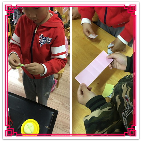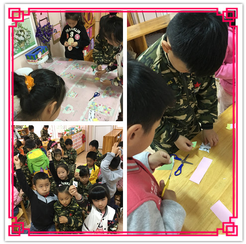今天是天天和宝宝的生日,小伙伴们送了他们两个一个蛋糕,两个小朋友很开心。天天说:“我们来分蛋糕吃吧,我们两人吃一样多好不好?”宝宝说:“好,可是他们不知道怎么分才能把蛋糕分得一样多呢?”我们大五班小朋友积极开动小脑筋,想出了好几种方法帮助他们俩平分了蛋糕,还学习了将平面图形四等分的方法,真棒!