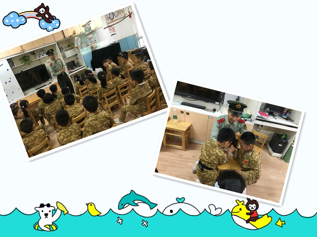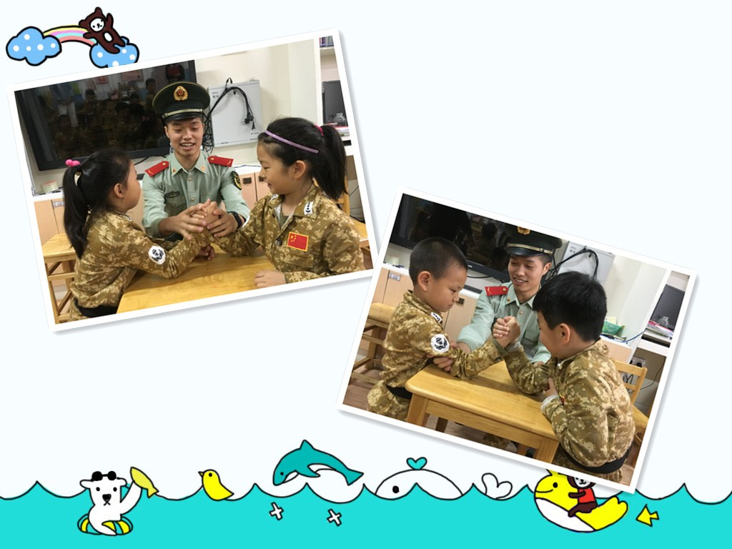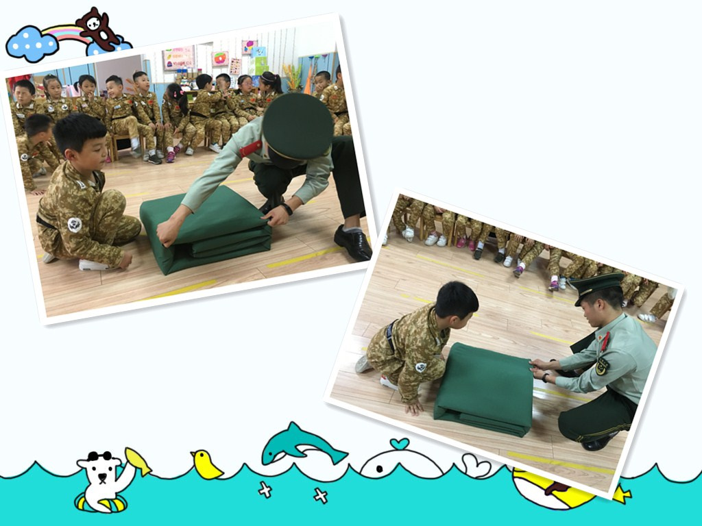 我们今天穿上统一的军服,我们知道今天要军训了,教官和我们一起玩了扳手腕的游戏,还给我们展示了他们是怎么给我们展示叠被子的。