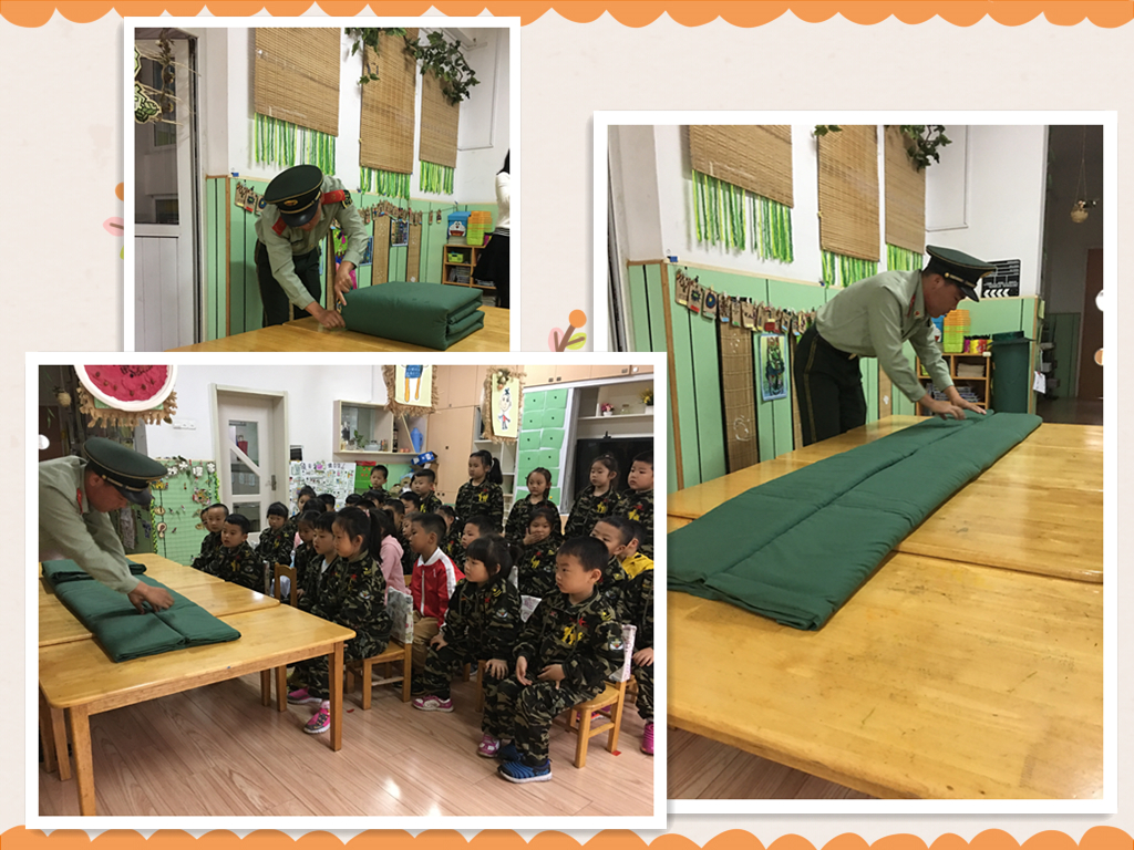 我们跟着消防员叔叔学习把被子叠整齐,叔叔说:被子叠好容易,但是整理比较难,边角要成线。