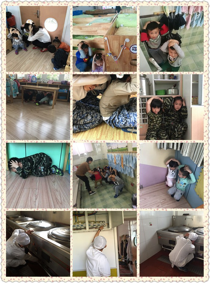 演练前, 各班教师对幼儿进行有关地震现象的讲述,并教给幼儿正确的自救方法:地震来临时,首先要找到地方避险,如桌子下,床肚下、柱子旁边和洗手间的三角区等,并知道在躲避时要护住头颈;演练开始前,安全岗人员提前五分钟到岗,清理通道。演练中,班级幼儿在教师的引导下听报警声音进行避险和逃生演练,整个活动紧张有序,全园18个班都能在规定时间内到集结点集合。