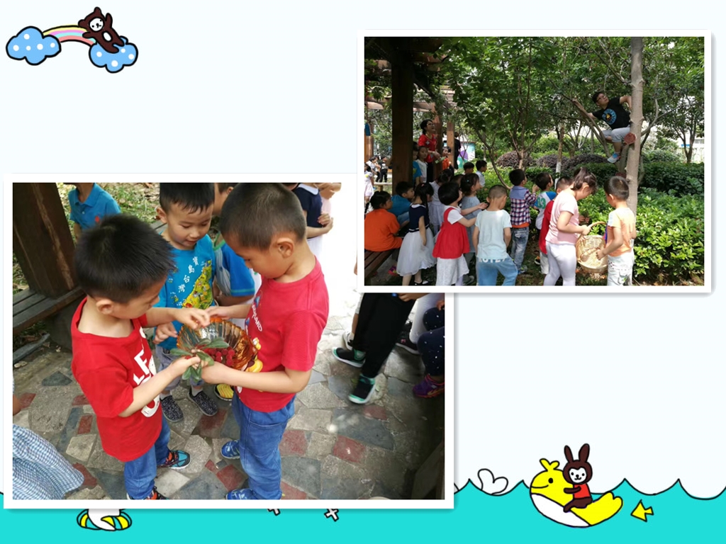 夏天来啦!小花园中的杨梅树结出了一颗颗红彤彤的杨梅果,李老师发现后组织大家来到小花园中,拿着小篮子一起摘果子!小三班 的江老师来帮助我们啦,他轻轻地爬上杨梅树,将果子摘下来递给我们,我们迫不及待的将杨梅果收集到我们的篮子里,不一会,就摘了小小的一篮子。我们还发现了小花园中还有琵琶也成熟啦,高高的颜老师拉下一个树枝,戴老师和我们一起又摘了许多甜甜的枇杷果,大家可开心啦!