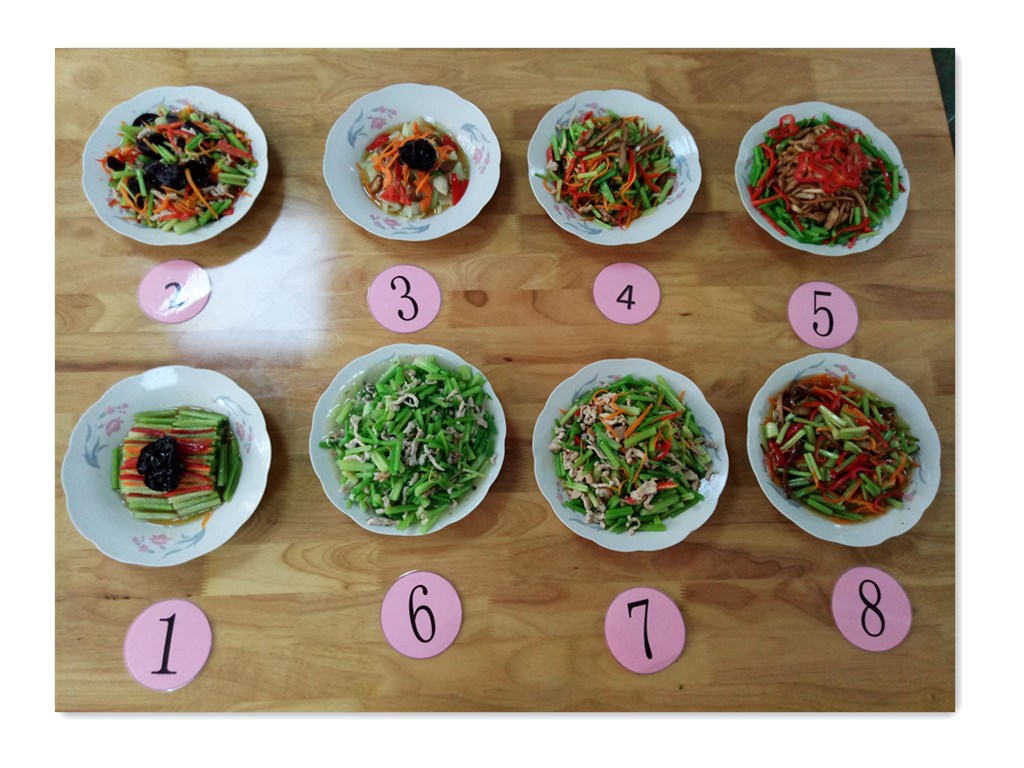 现场操作竞赛,炊事人员分成两组,一组一组的进行,第一组做好准备,由保健老师发出开始口令,炊事人员在半小时内进行现场操作,先切配在烹饪,装盘,结束后,第二组再开始。