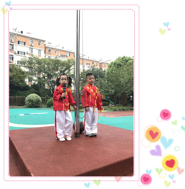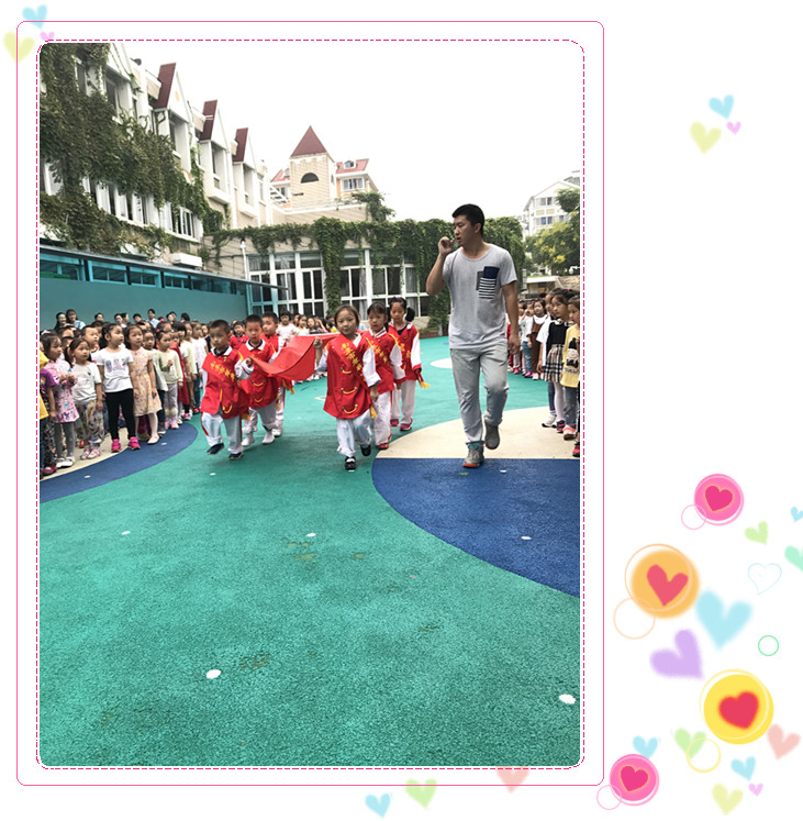 国歌响起来了,你瞧!六位护旗手护卫着国旗,步履轩昂大步向前走,雄赳赳、气昂昂,赢得了老师、家长和小朋友们赞赏的眼光。升旗手有节奏地拉动着升旗绳,鲜艳的五星红旗徐徐升起。