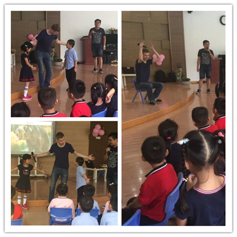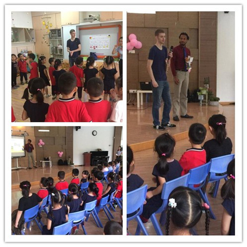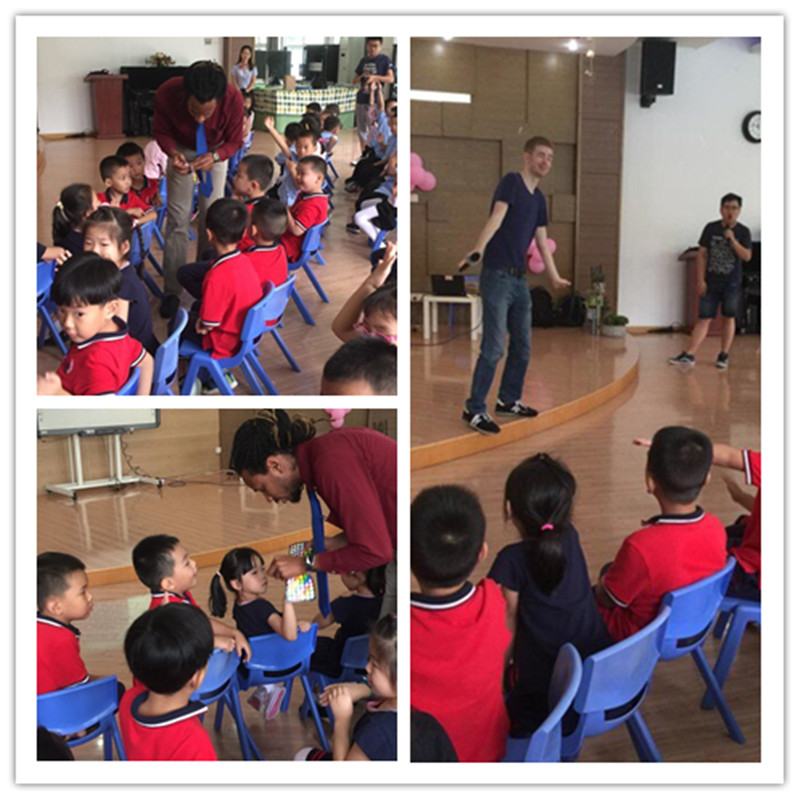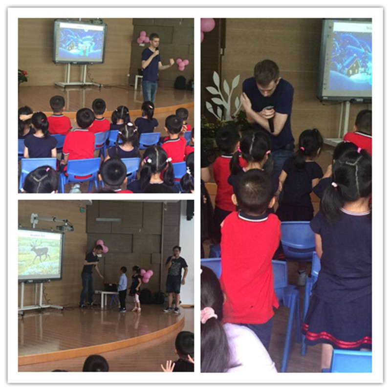 今天我们为刚升入大班的小朋友们请来了外国友人,孩子们对外国友人的生活很好奇,七嘴八舌的问着外国友人吃什么穿什么,还有喝的酒是不是和我们一样的……等等问题。同时外国友人也和孩子们分享了他们的语言、环境等,让孩子们接触到了一个全新的世界。