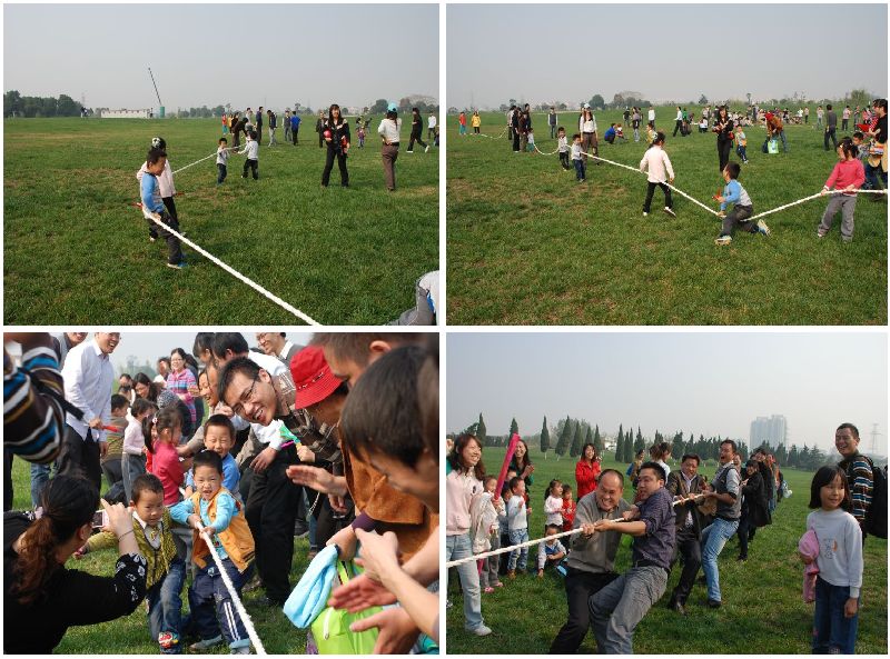 小朋友和小朋友拔河比赛,爸爸妈妈和公司的叔叔阿姨比赛,哈哈!最后我们的爸爸妈妈胜利啦!爸爸妈妈你们好厉害哦!