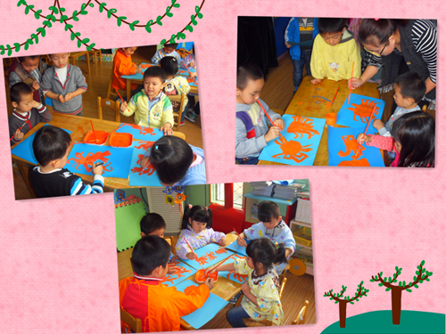 “螃呀么螃蟹哥,八呀么八只脚,两只哟大夹夹,一个蟹壳壳。”看看我们用水粉颜料画的大螃蟹吧,比比看谁的螃蟹爬的快!