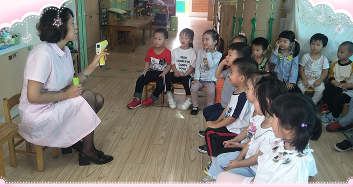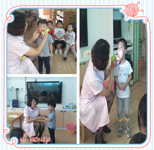 今天我们班来了位新老师教我们学本领,是我们的保健老师。她呀每天早晨可忙了,要给我们小朋友检查身体,老师告诉我们这叫“晨检”。 这是给我们检查的工具——体温计和手电筒 摸摸下巴,看看嘴巴,检查小手、测测体温 保健老师很关心我们小朋友,每天都要给小朋友检查,这样才能发现有谁生病了,就可以赶快去医院看病。以后我每天都要好好晨检。 |