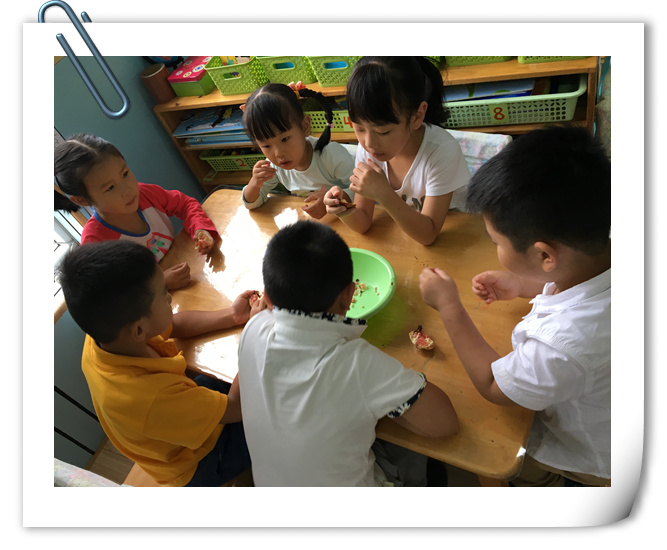 秋天来啦,秋天是丰收的季节,幼儿园的石榴树上结满了石榴,大六班的小朋友在花园里采摘了成熟的石榴,带回班上和其他小朋友分享,孩子们先观察了石榴的果皮,闻了闻石榴的香气,然后一起剥开了果皮,看见里面满满的石榴种子,一起品尝了酸酸甜甜的石榴,吃完后还自己把桌面收拾得干干净净,自己摘的石榴真好吃!