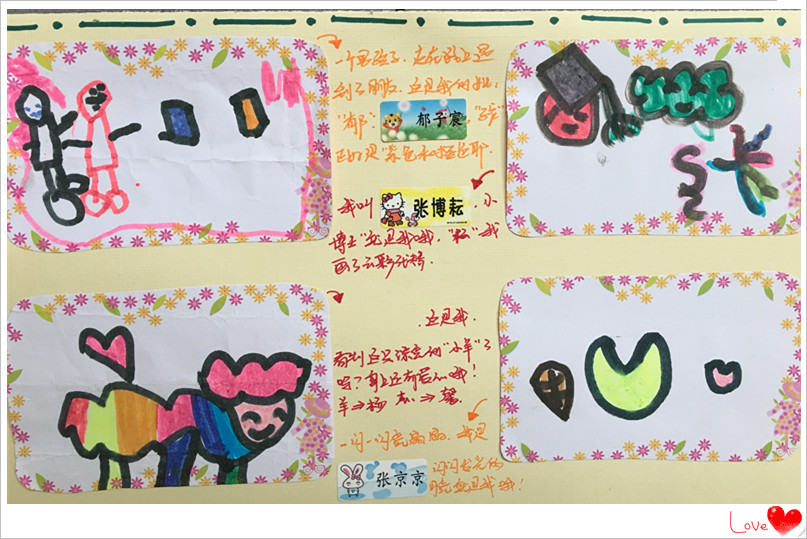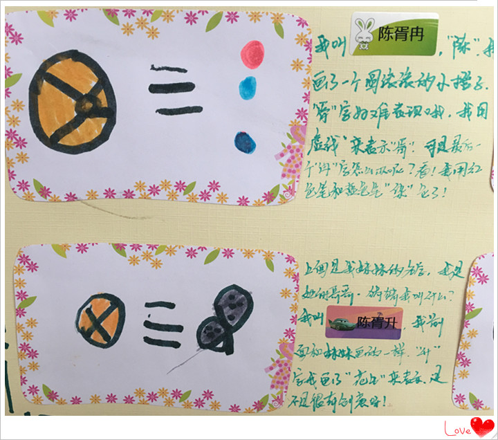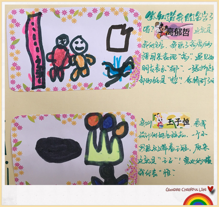 姓“曹”的小朋友画了一丛小草,姓“马”的小朋友画了一匹小马等等,让我们看一看他们制作的“姓名标志”吧!你能猜到他是谁吗?
