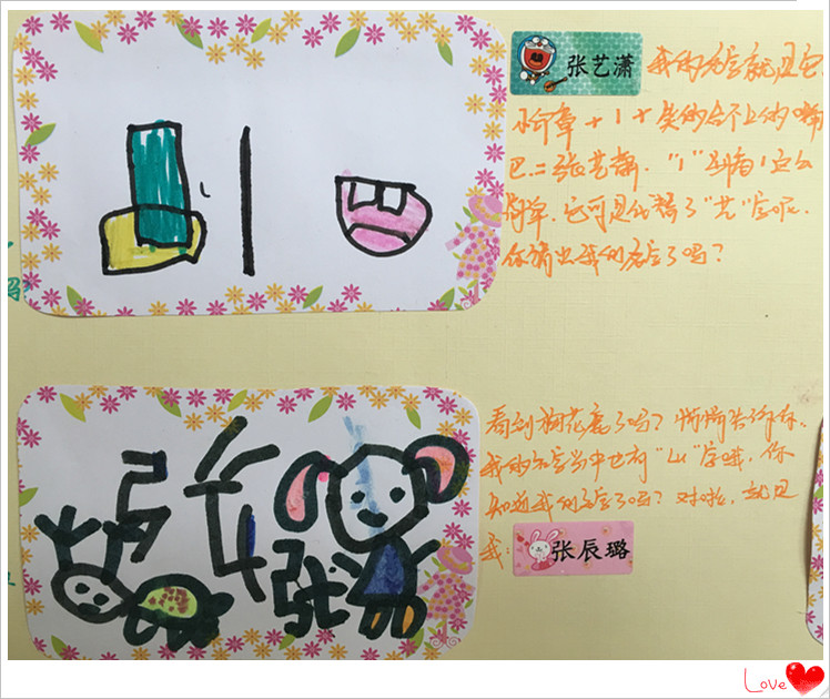 今天,大一班的小朋友想了一种好办法,把自己的名字“画”下来,制作一种只属于自己的姓名标志。孩子们积极动脑,奇思妙想,你瞧,他们把自己的名字变换成一种图案或者是一种简单的符号。