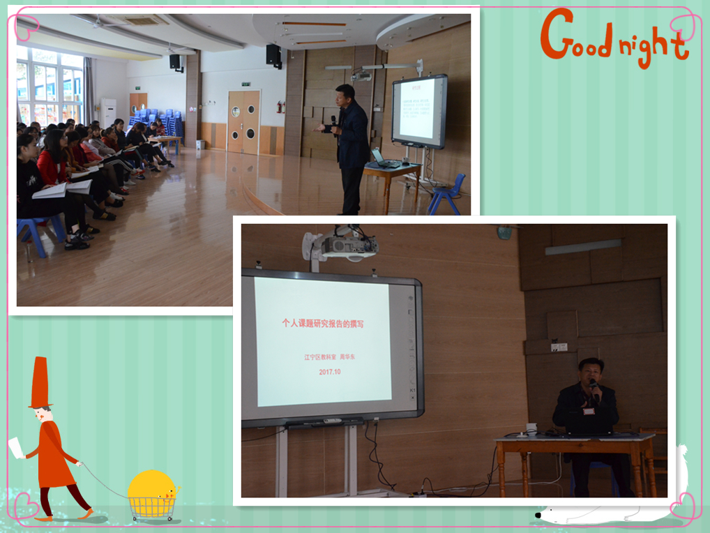为提升教师对个人课题的研究意识,10月17日中午翠屏山幼儿园隆重邀请了区教科室周华东老师就“个人课题研究报告的撰写”对全体教师开展了精彩的专题培训。