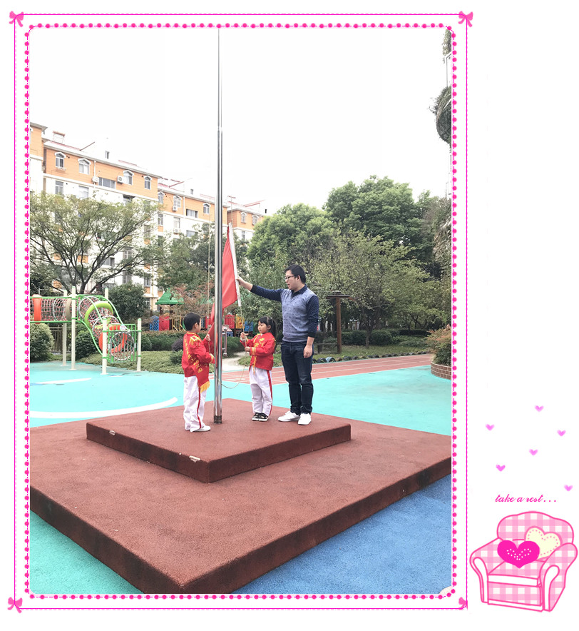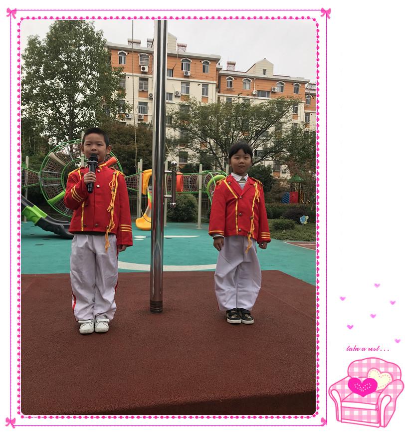 新的一周开始了,阳光明媚,秋风习习,翠屏山幼儿园全体师生在大操场上举行庄严的升旗仪式。8:30升旗仪式正式开始。担任本周升旗手的是来自大五班的张乐持和钱一漪,他们都是活泼开朗、谦让有礼的小朋友。瞧,国旗下的他们正在做自我介绍呢!