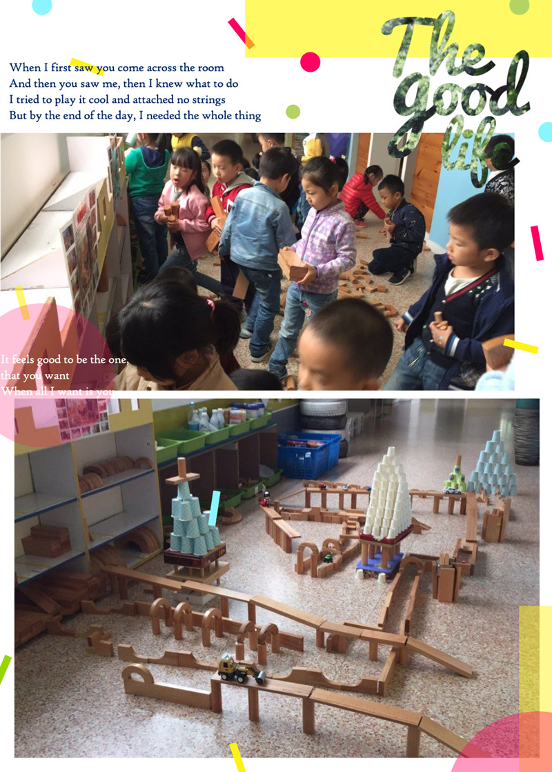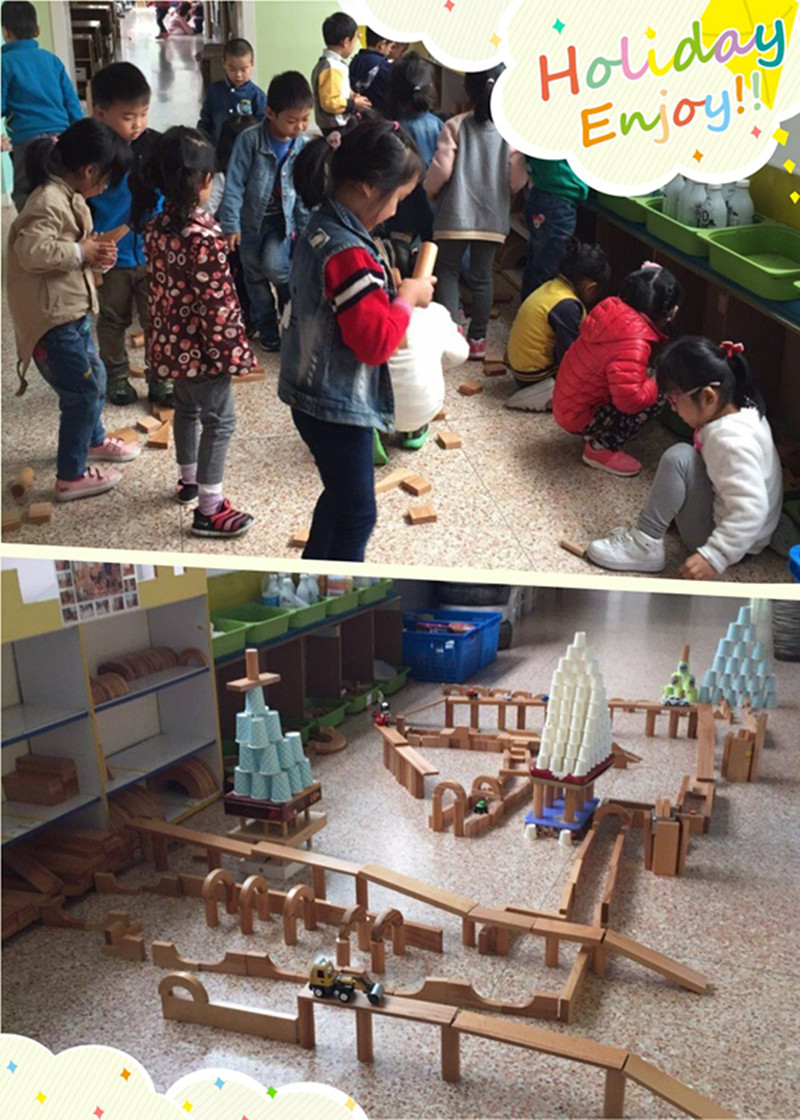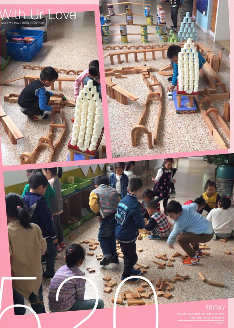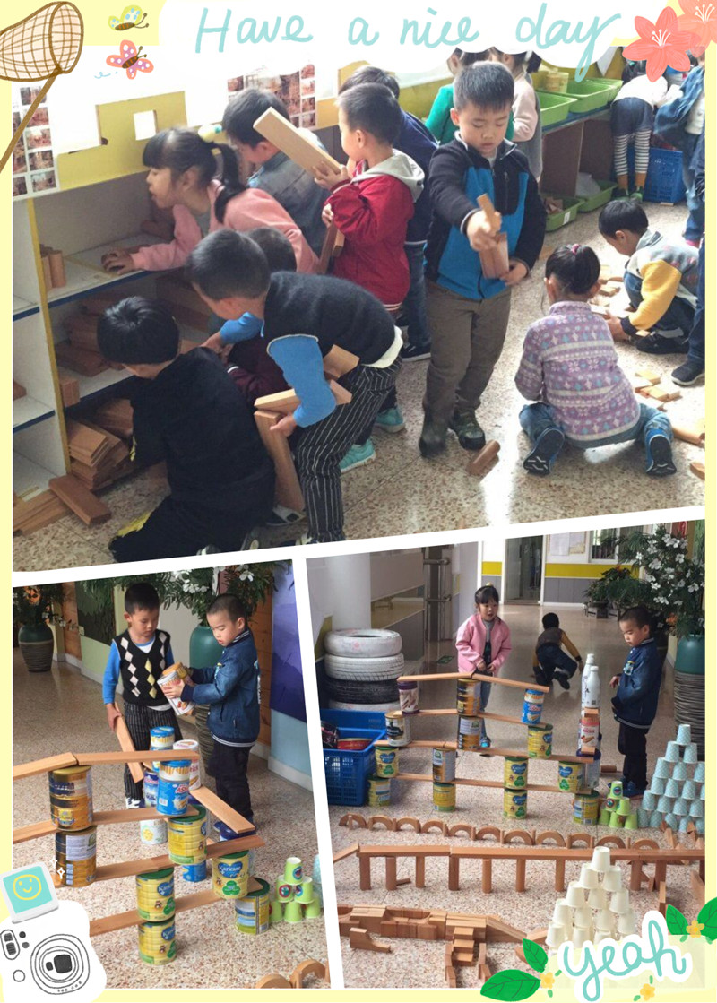 今天,大二班的小朋友们都成了建筑工程师,他们在建筑工地上辛勤的、快乐的施工着,发挥了他们丰富的想象力,除了木材之外,还用了很多材料如纸杯、塑料瓶、奶粉罐等等在建筑之中,最终搭成了有桥、有城堡、有拱门、有围墙的一座美轮美奂的建筑。孩子们通过这种空间搭建练习,充分使用各种材料,互帮互助,大胆创造,促进了孩子们的自主、自立的能力以及各方面的发展。