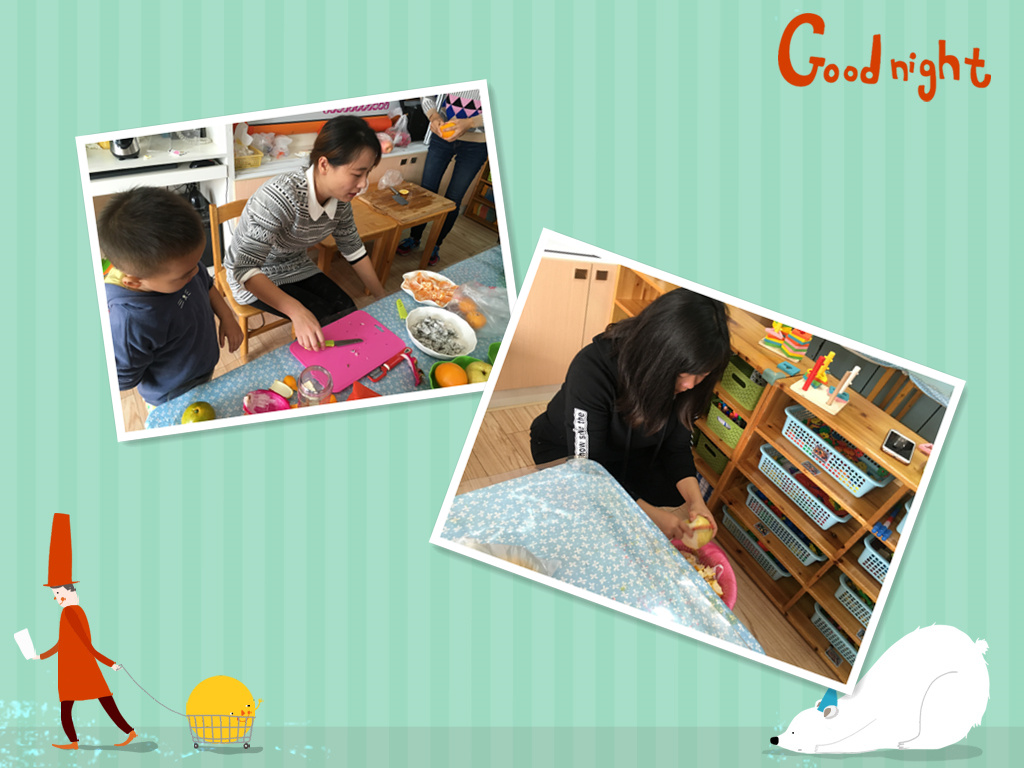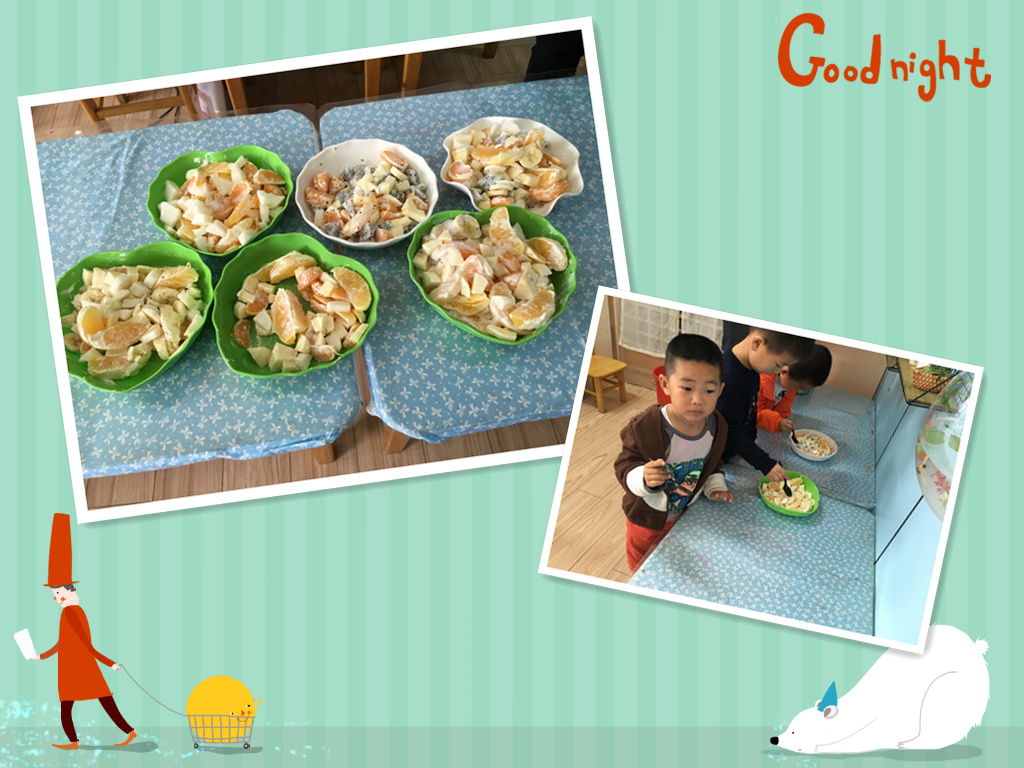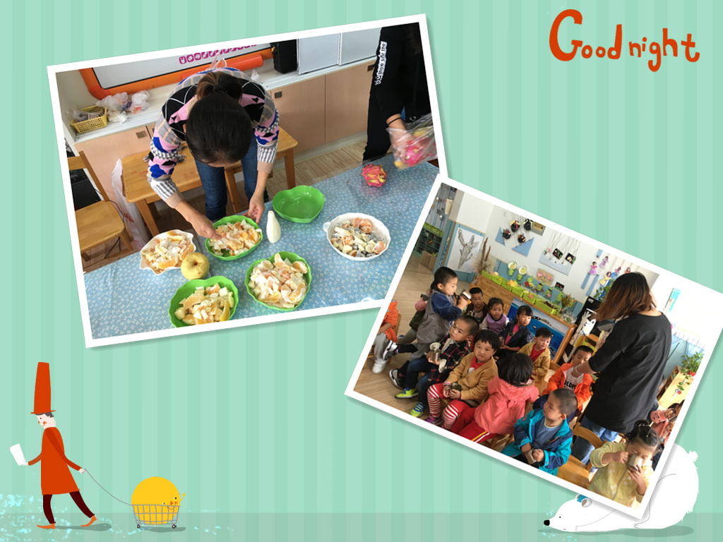 今天妈妈来给我们上课啦!今天妈妈们要给我们学习什么本领呢?我也不知道,不过看到妈妈们拿出沙拉酱、酸奶、水果我就知道了!要做水果沙拉!