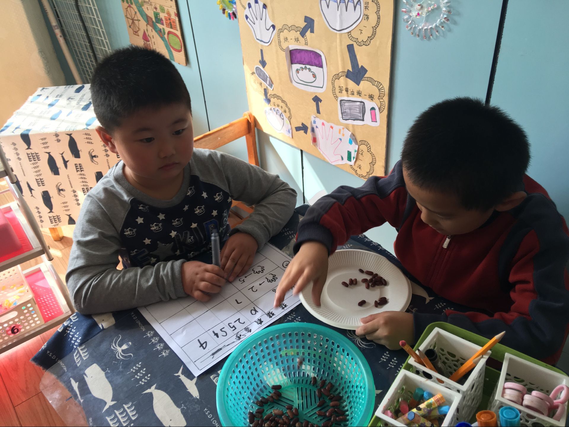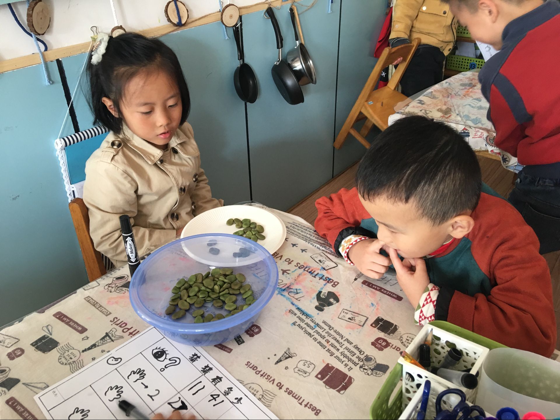 数豆子,分豆子。豆子多多,有几个? 孩子们在种子的世界畅游。抓一把豆子目测看看有几个?再数一数看看你猜对了嘛。好玩的豆子游戏让孩子们对种子充满着浓厚的兴趣。每天区域游戏中也总能看到小手抓一把豆子数来数去。