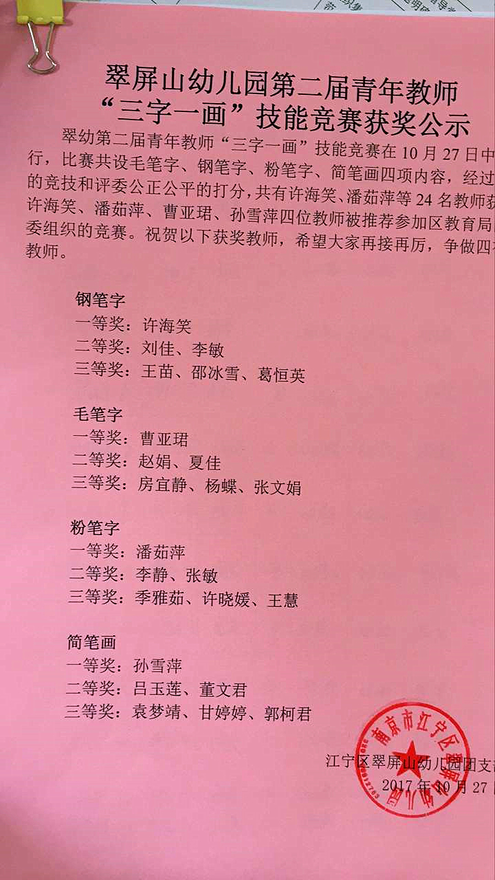 为进一步提高广大青年教师职业素养,激发青年教师对中国传统文化的积极传承以及学知识、钻业务、练技能的热情,提高青年教师全面、扎实掌握“三字一画”基本功技能,根据教育局团工委和幼儿园工作安排,我园于2017年10月27日开展了翠幼第二届青年教师“三字一画”技能竞赛。