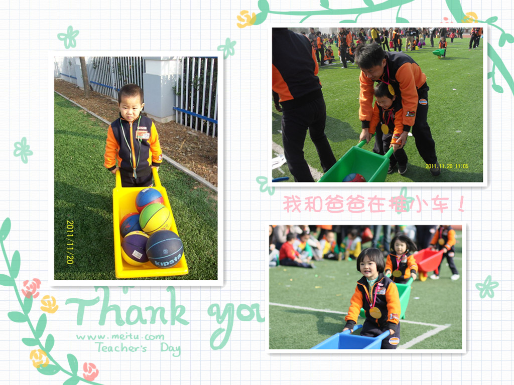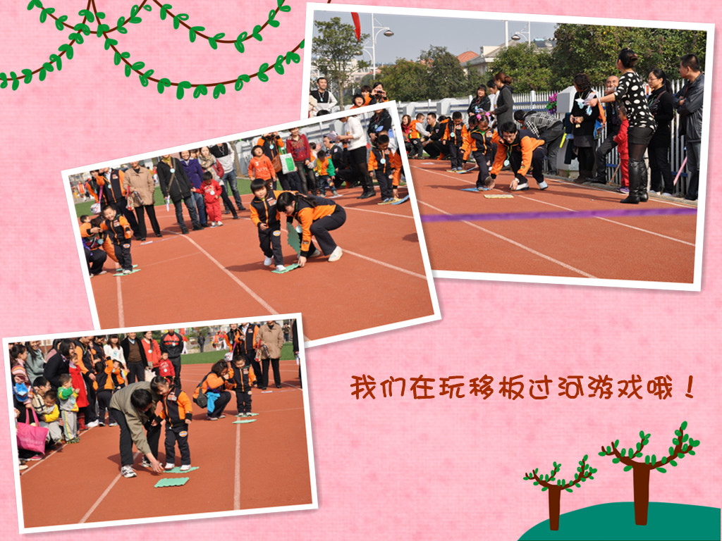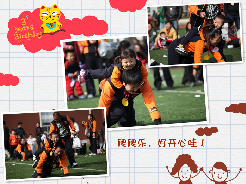 一年一度的亲子运动会开始啦!我带着爸爸妈妈一起来参加运动会,我们参加了“推小车”、“爬爬乐”、“移板过河”等许多游戏,玩得可开心了!