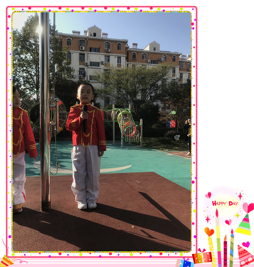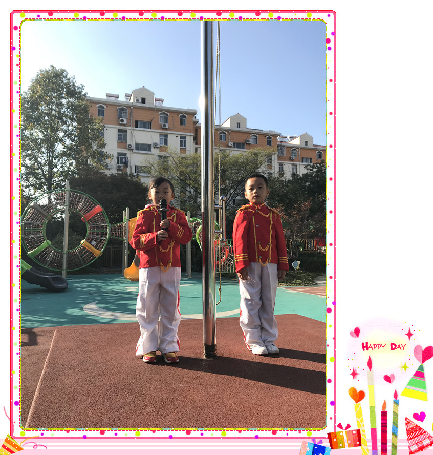2017年10月30日星期一,微凉的秋风似乎为这个早晨增添了一丝寒意,但是却丝毫没有影响小小升旗手们的热情。大家看到大六班的倪子越和周悦佳站在国旗台边上正进行自我介绍呢,他两笑容满面,神采奕奕。六位升旗手护卫着鲜艳的五星红旗在场外安静地等候着,守卫着美丽的红旗。