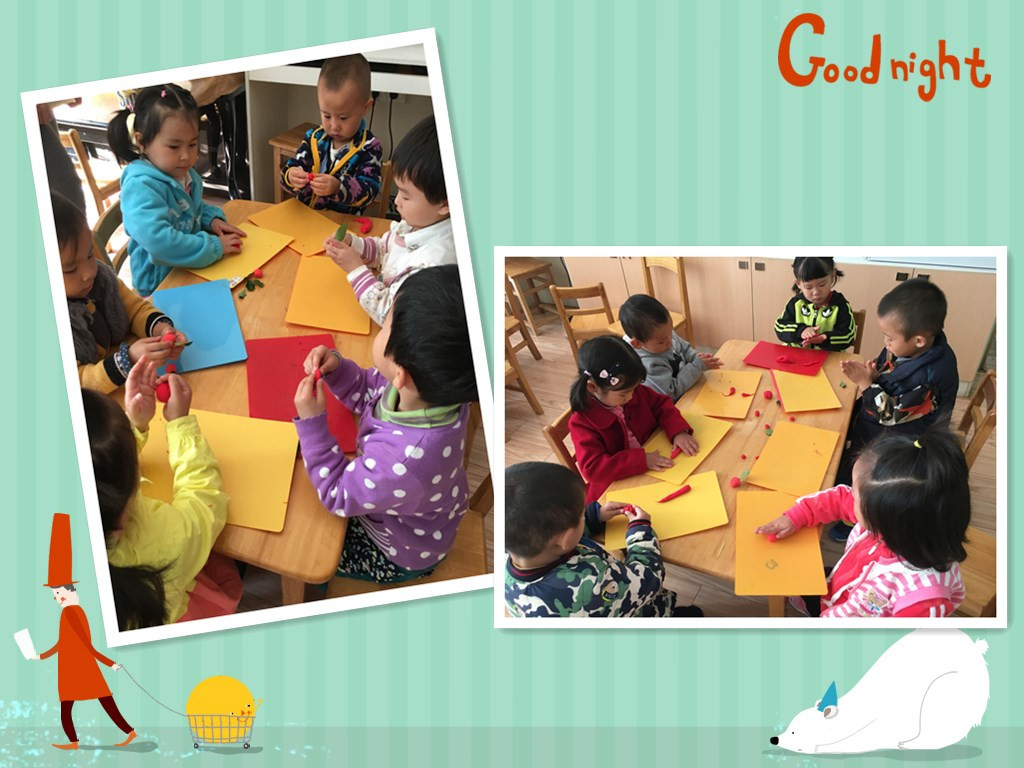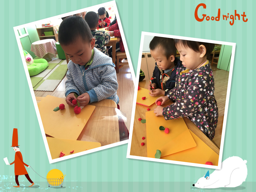 “搓一搓、分一分,团一团”苹果宝宝出现啦,我们“水果店”里的苹果宝宝都很新鲜啊,还有叶子连在上面呢,你看,我们把小树叶插在苹果上我们的苹果是不是更美啦!我们的水果店马上准备开张了,欢迎你来卖水果哦!