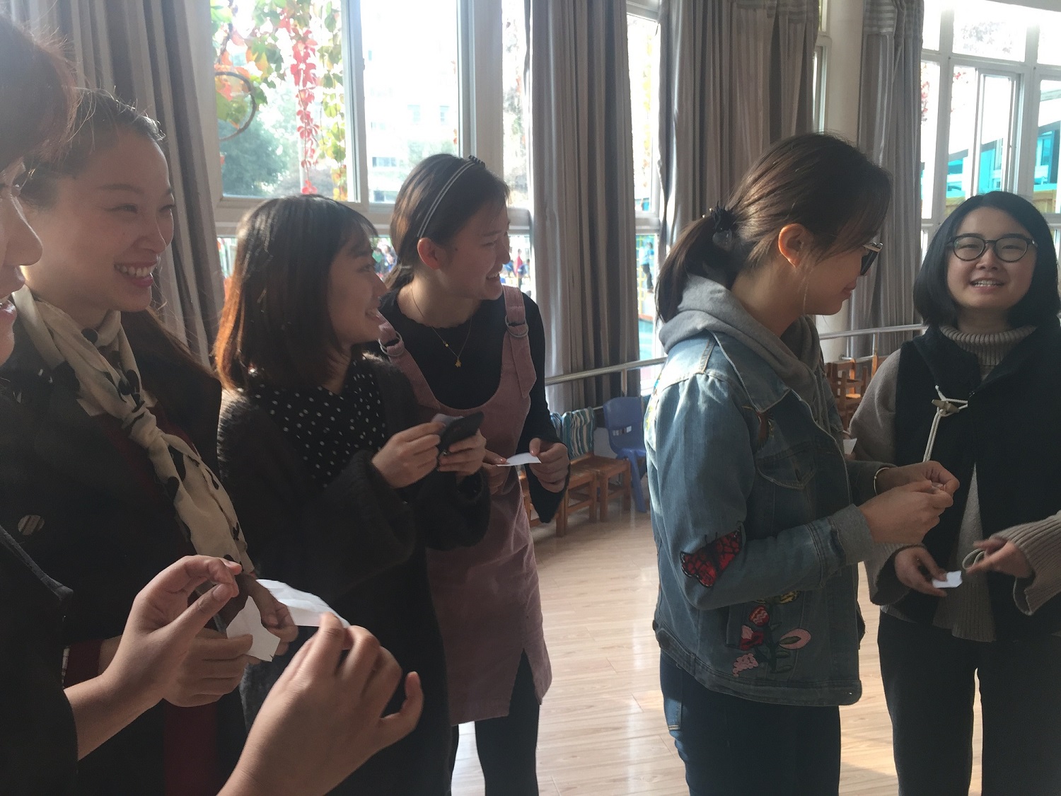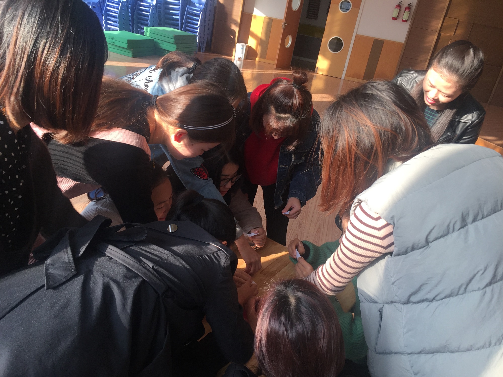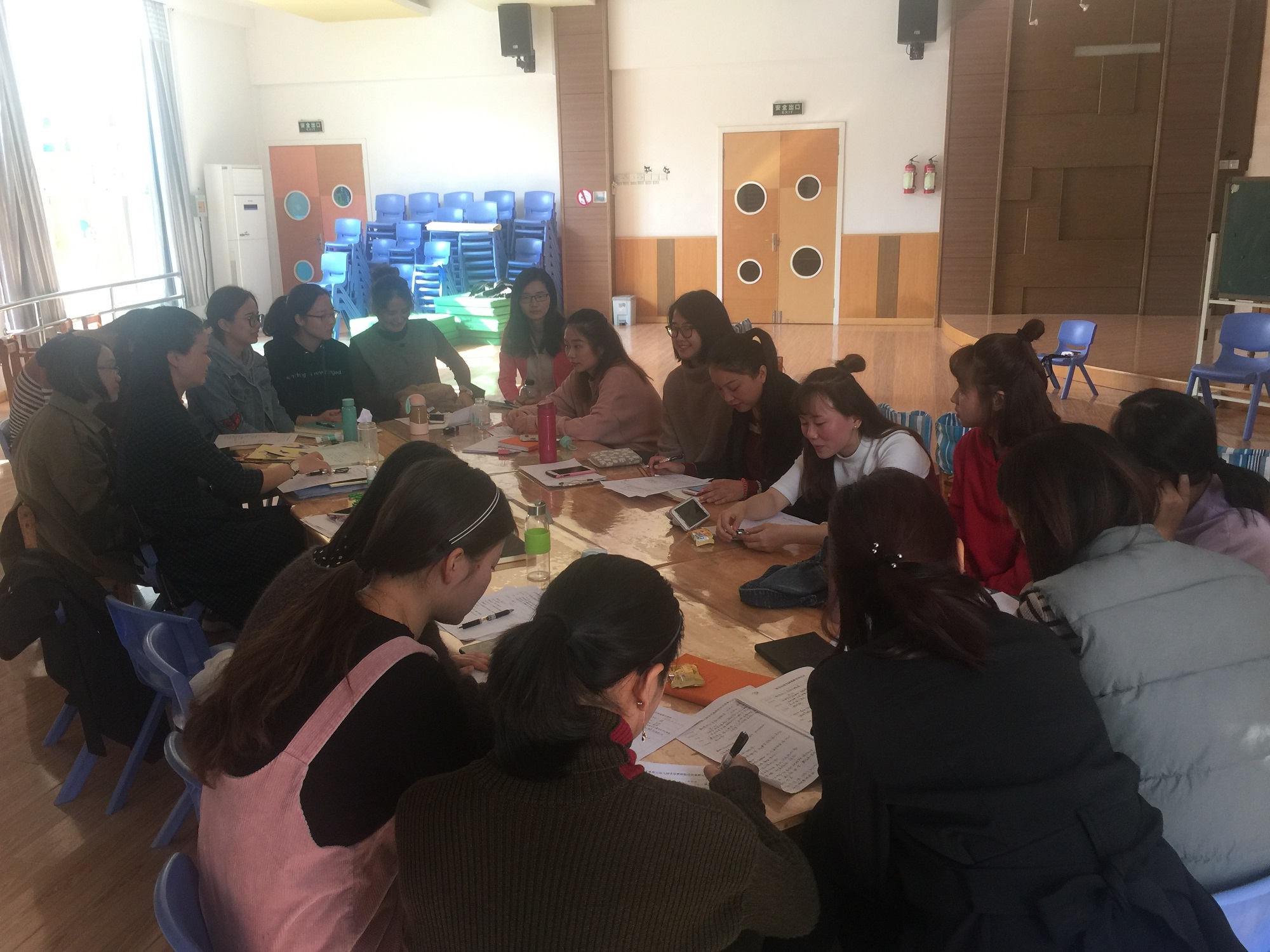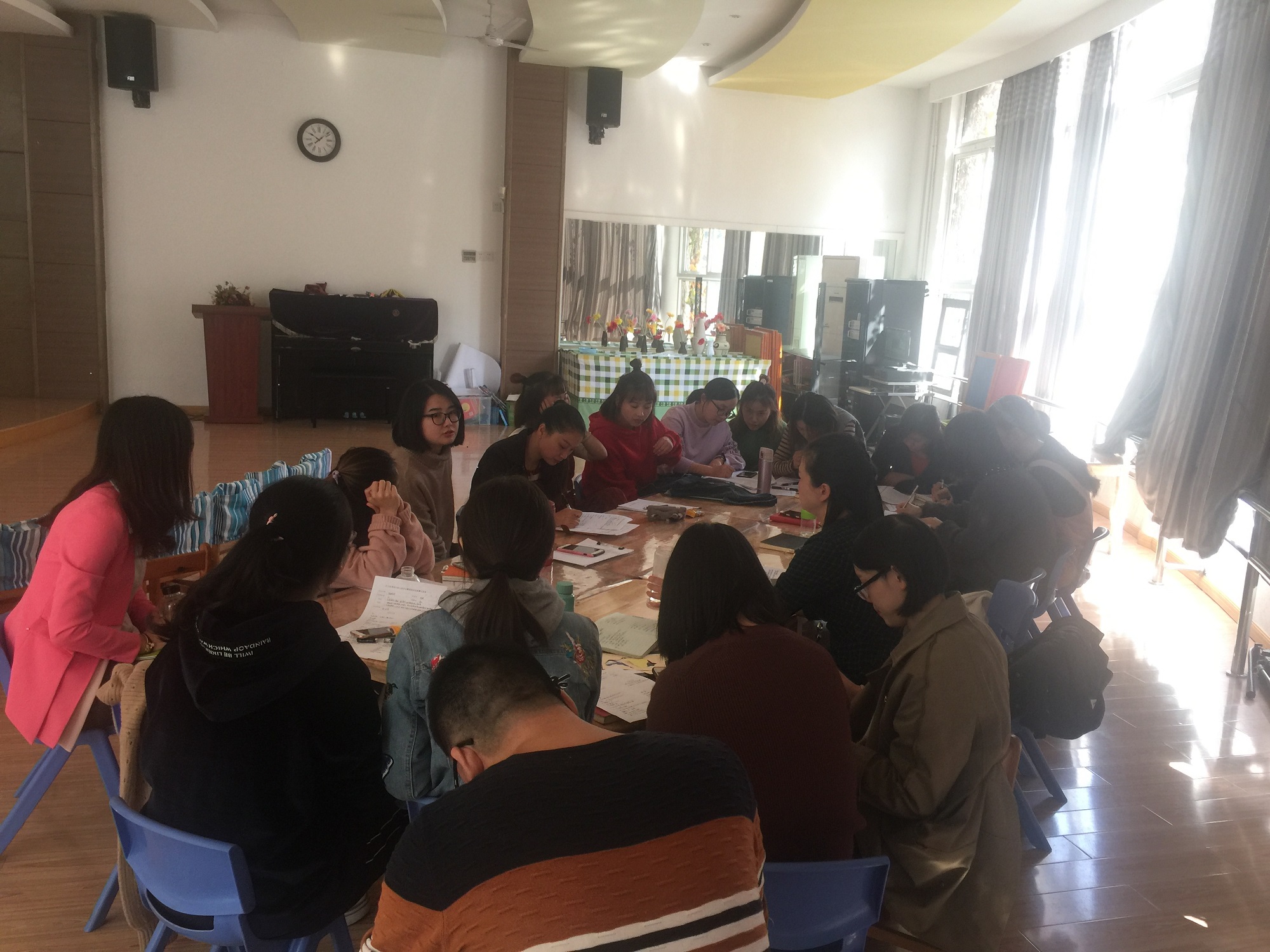 通过抽签,本次教研的展示对象分别是徐燃和李芊老师,配琴的是袁梦婧和孙雪萍老师,抽签结束后,四位老师去准备,其他老师对观摩《幸福的猪小弟》这节活动展开观摩的想法和讨论。老师们各抒己见,表达了自己的一些看法。比如有老师建议,还可以用对唱的形式进行一问一答;图谱的使用不能表达对抽象歌词的理解;幼儿学唱歌曲的形式还可以更多样;手语也可以让幼儿尝试自己创编等等。经过大家如火如荼的讨论结束,展示课就开始了。每个老师在听的过程中都很认真的填写观摩记录表。由于本学期有新的成员的加入,我们邀请李敏老师帮我们还拍了本学期音乐教研组的大合照。