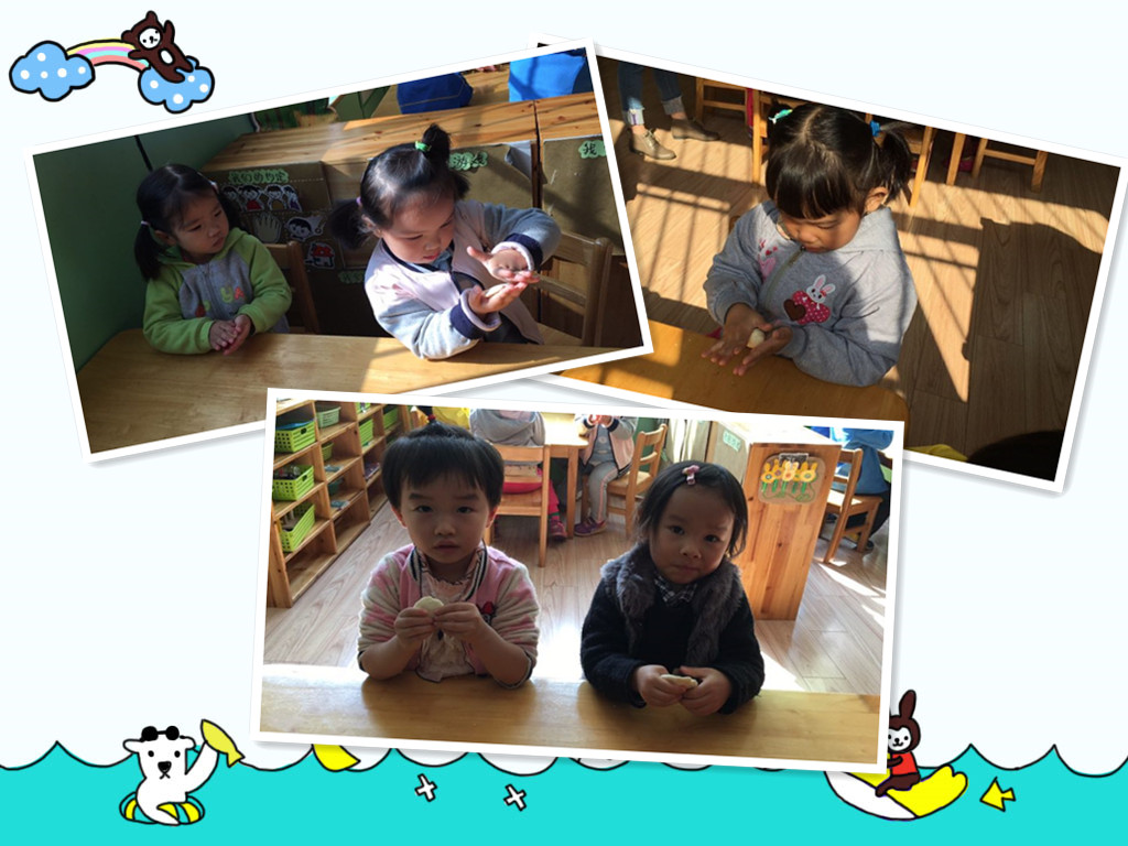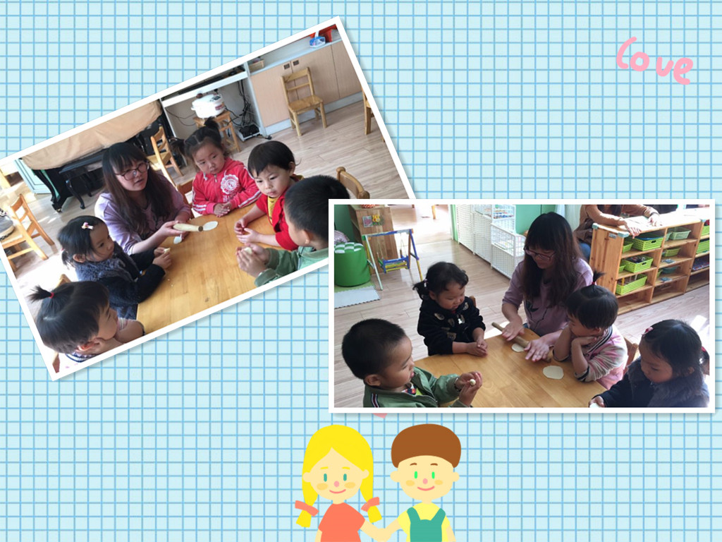 你看我们做的多认真啊!小手动一动,饺子皮就变成啦!