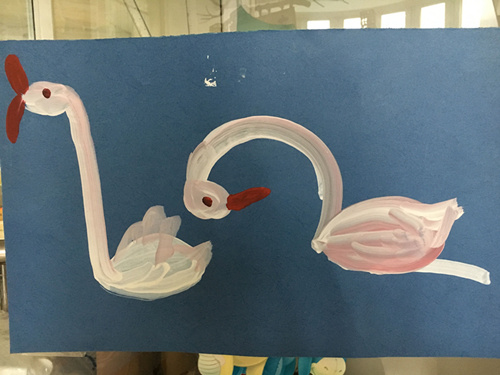周末爸爸妈妈带我们去动物园看了美丽的天鹅,长长的脖子、白白的羽毛,在水里游泳的样子真是好优雅啊!还看到了天鹅妈妈带着天鹅宝宝在水中嬉戏。老师还带我们用水粉把优雅美丽的天鹅记录在了纸上。