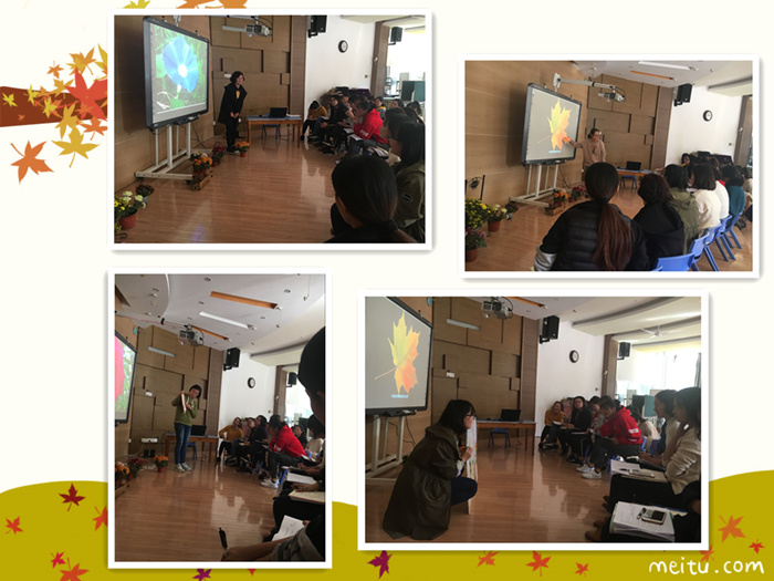 体验心跳,高效教研 为了给教师创造一个更好的相互交流、合作、探索的校验平台,提升教师组织集体活动的能力,11月9日,我园美术教研组开展了第二次教研活动。本教研活动分为三个部分。第一部分由由教研组长——葛恒英老师结合《3-6岁儿童学习与发展指南》,解答平日中教师在组织美术活动中的困惑,如——什么是示范,范画是否需要等。教师们豁然开朗,受益匪浅。第二部分由贾青老师带着小班的孩子们领略秋天多彩的梧桐树叶,红的、绿的、黄的,并用手掌印画的方式变出满树的梧桐树叶,有的在天空中飞舞,有的落在地上,还有的在树上摇啊摇。房宜静老师带着中班的孩子们走进了美丽的花园,高的、矮的,红的、黄的,一簇簇、一片片,美不胜收,并用滴画和借行想象的方式变出了缤纷的花园。第三部分毛园长带领所有的教师采用了一种新的教研方式——由一名教师组织活动,其余教师扮演学生,从幼儿的角度审视活动中教师语言组织的适宜性和有效性。不仅聚焦于教师活动组织的能力,更提高了教研的效率。在这种新的教研方式下,提升了教师们对活动中语言运用的深思和反思。