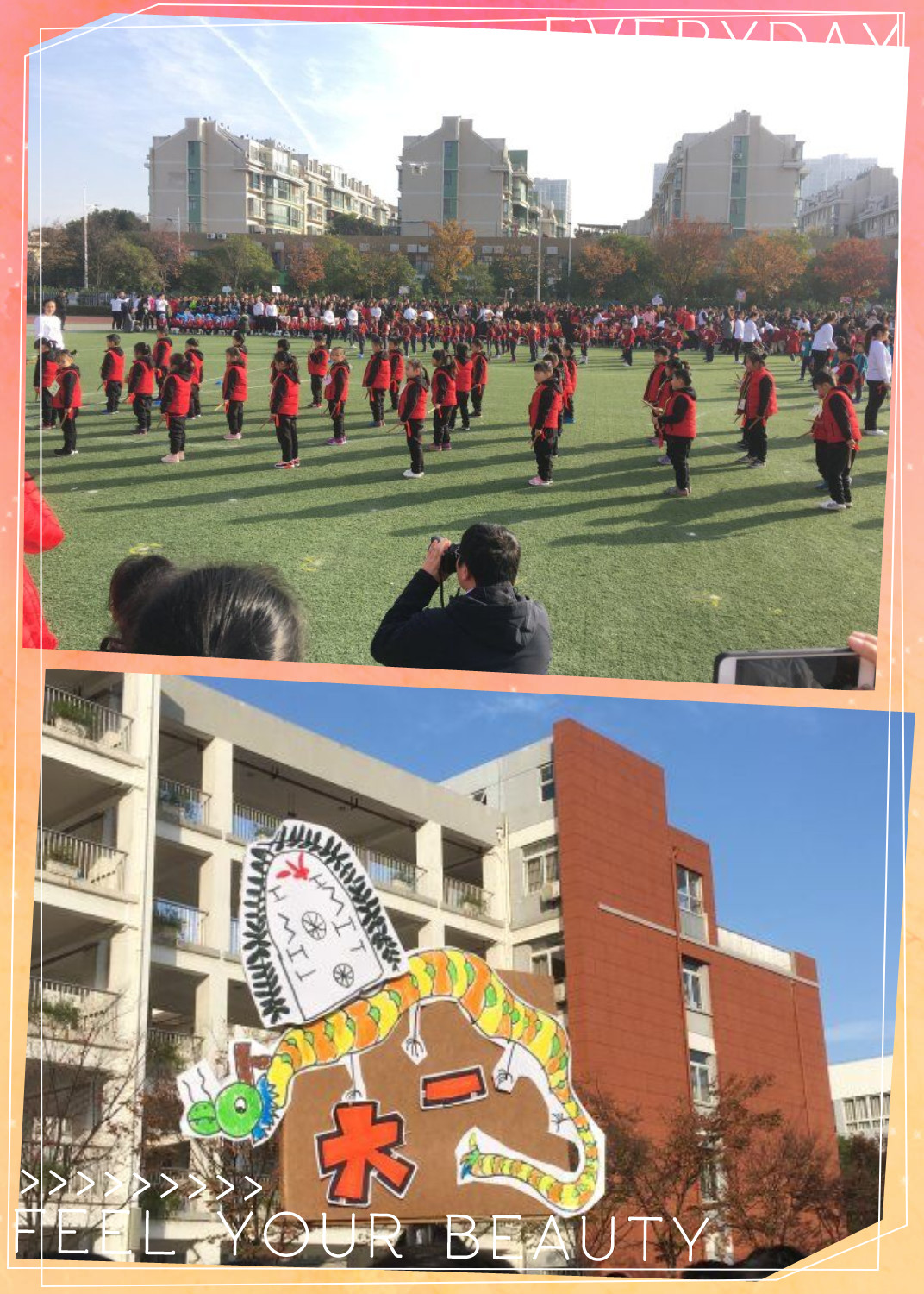 看!大一运动村的小小运动员们向我们走来啦!在为期三周的运动课程中,通过丰富的集体活动、小组活动,共同商讨出了代表大一运动村的吉祥物:龙!体现了小小运动员们自尊自信、自强不息的精神!以及属于他们的班徽:由橄榄枝和代表大一的英文字母组成,象征着胜利!勇敢!在这些丰富的活动中,孩子们认识了许多运动器械,瞧!他们还将这些运动器械搬到了我们的赛场上!他们骑着山地自行车,踏着滑板车,转着呼啦圈,手拿着筷子有节奏的来啦!