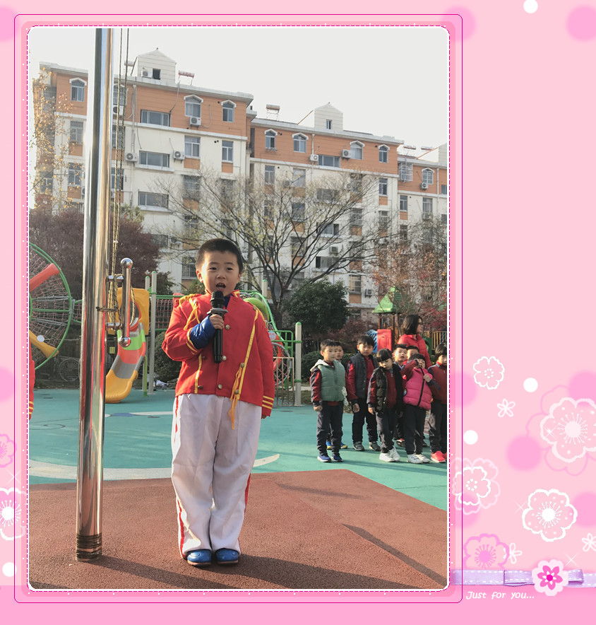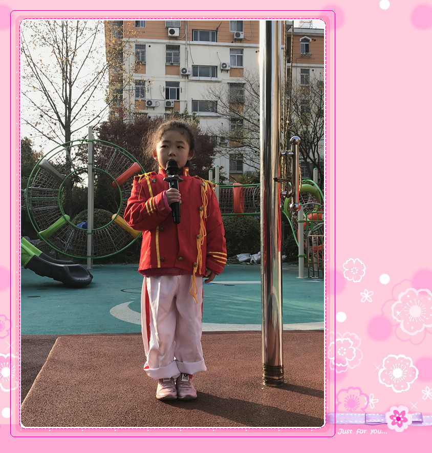 今天是2017年11月27日,阳光明媚的冬日,我们又迎来了翠幼本周的升旗仪式,大五班的小小升护旗手们早早的就来到了国旗台下,沐浴在晨光中。每个班面对国旗排着整齐的队伍,等待着升旗仪式的开始。让我们来看一看今天的升旗手是谁呢?他们是来自大五班的陈旭尧和童书瑶小朋友,他们正充满自信的站在国旗台上做自我介绍呢!