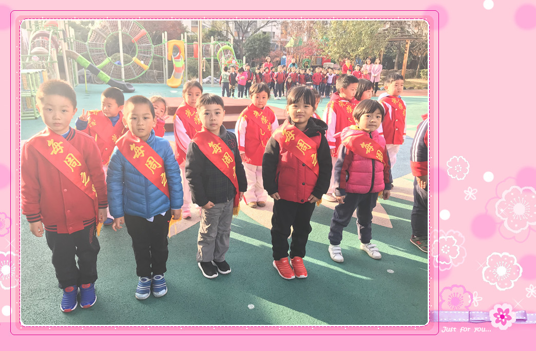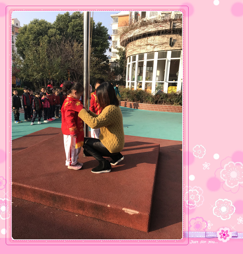 园长妈妈正在给升旗手们佩戴光荣的绶带。