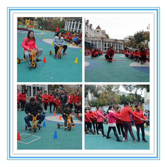 此次教职工运动会是基于园本运动主题课程基础上、在孩子的提议讨论下下开展的。运动会前孩子们和老师一起讨论了关于运动的形式、运动的项目。教职工们分为三个工会小组,兴致勃勃的参加了跳羊角球、骑小车、绕障碍拍球等个人赛及接力跑、蒙眼蹲行、扔沙包、拔河等团队赛,