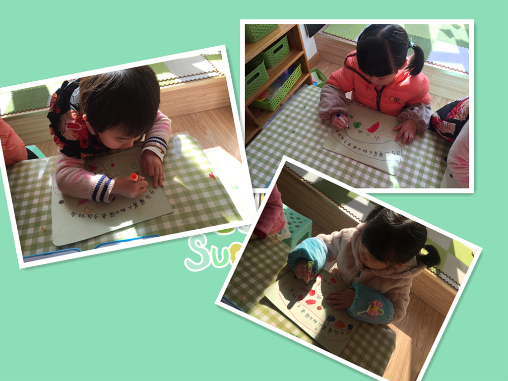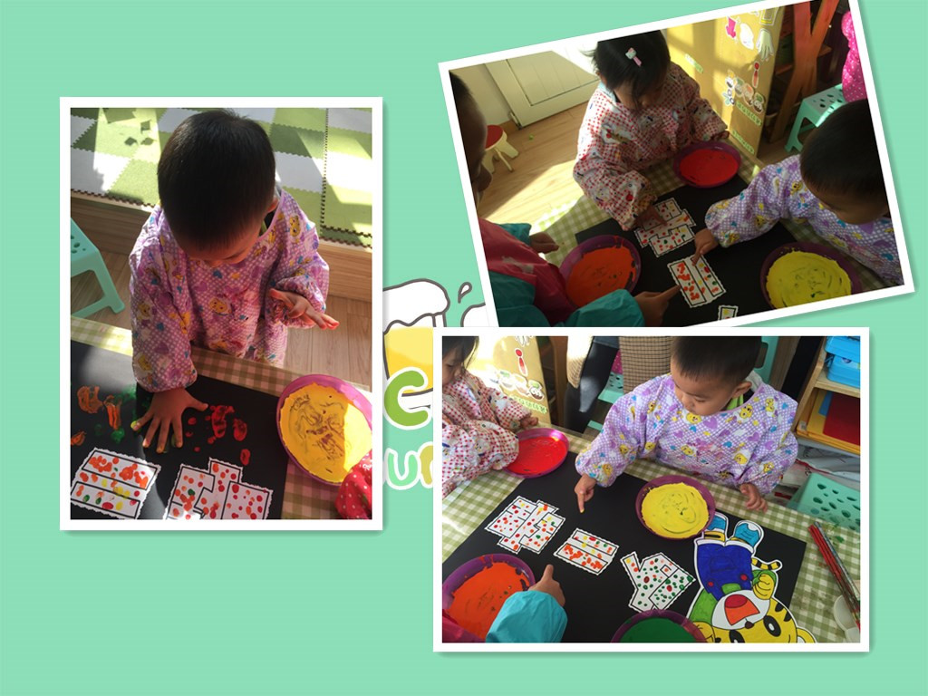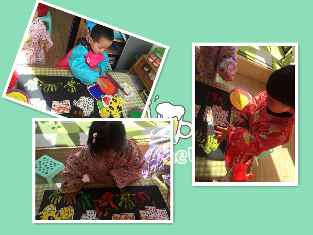 这是我们班的班牌,我们用小手蘸上颜料宝宝,用他亲一亲我们的班牌,除了手指点点我们的小手掌也可以印一印。