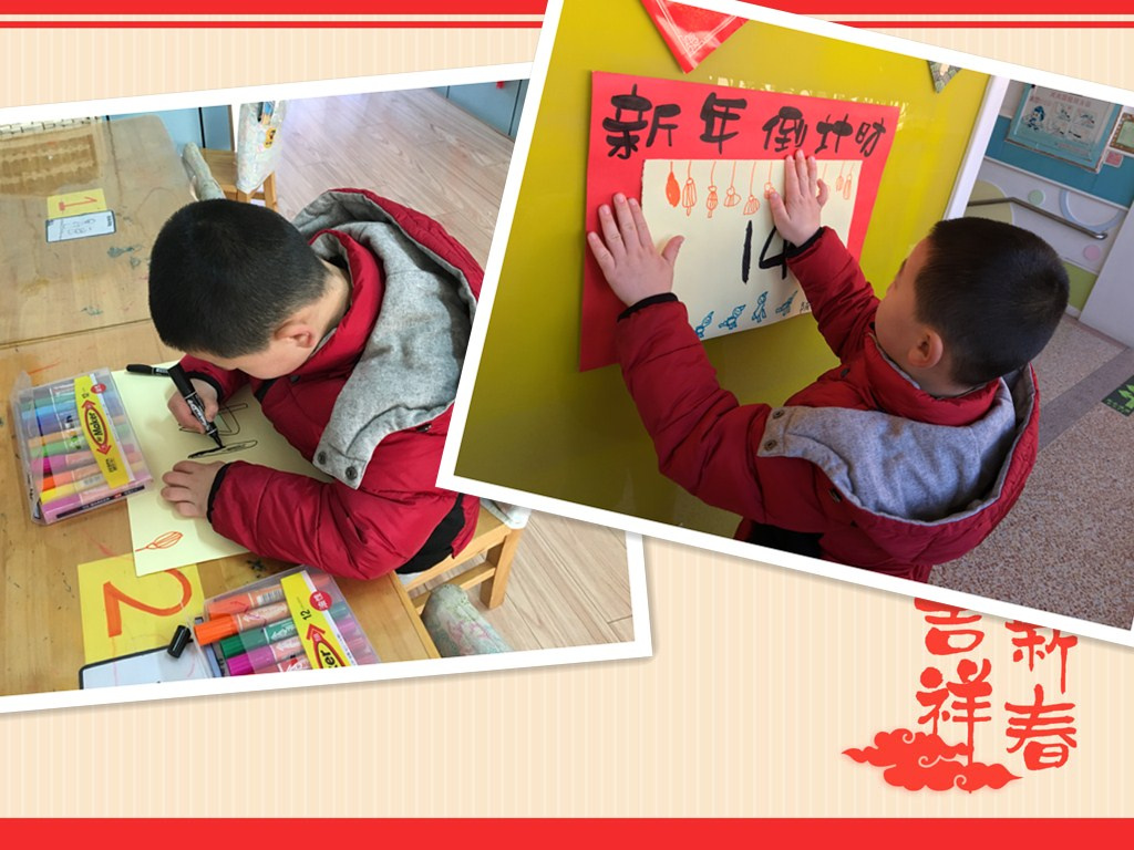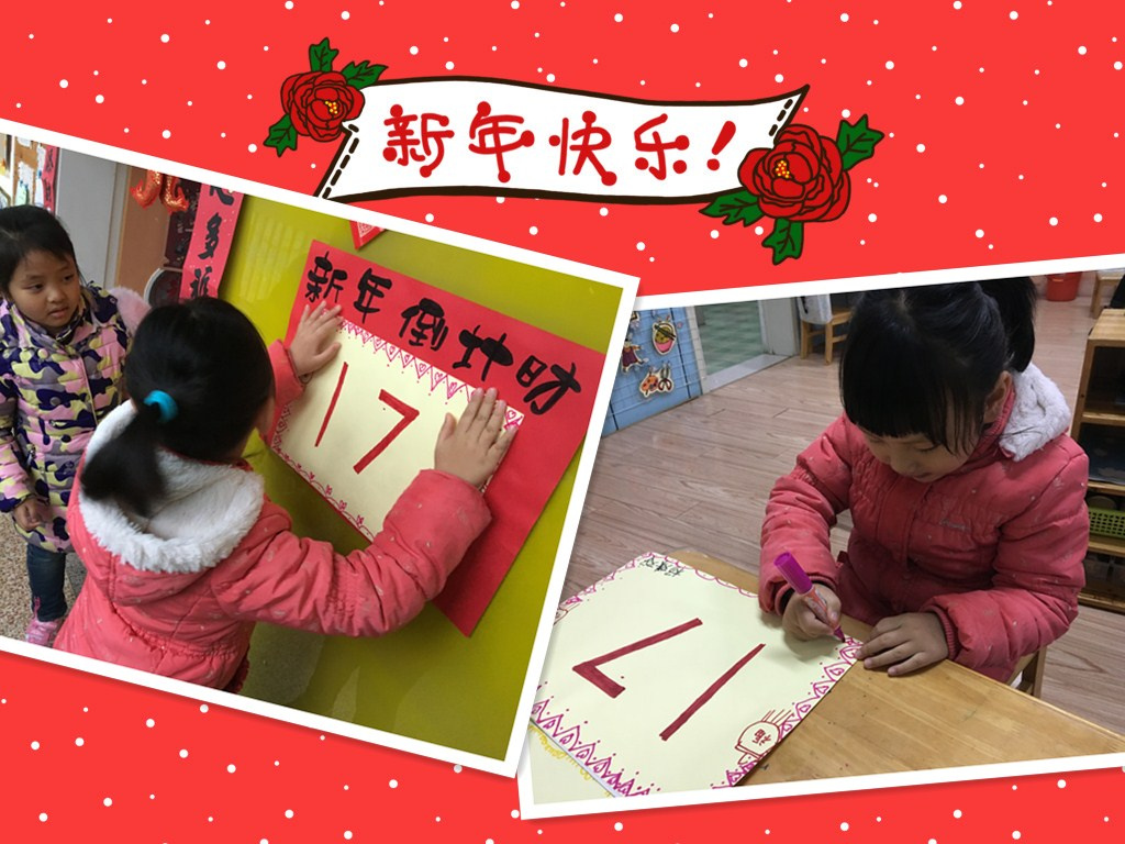 寒暑交迭,万象更新,不经意间,又将是新的一年。大六班的孩子们和老师们即将一同携手即将迈进充满希望的2018年。辞旧迎新,我们翘首期盼的元旦也将闪亮登场了,孩子们亲自制作了新年倒计时牌,来盼望即将到来的新年。在此过程中,孩子们发现、了解了生活中的数字,体会了数字之间的奥秘。