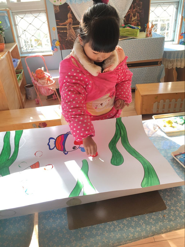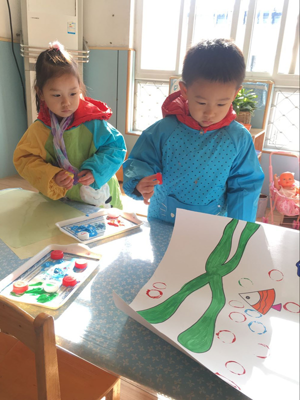美丽的泡泡 小鱼小鱼游啊游 嘴巴吐着气泡泡 大泡泡 小泡泡 泡泡就在水里飘 今天,我们用瓶盖印泡泡,瓶盖蘸上颜料印出来的泡泡,像是从小鱼的嘴巴里吐出来的一样,真开心~