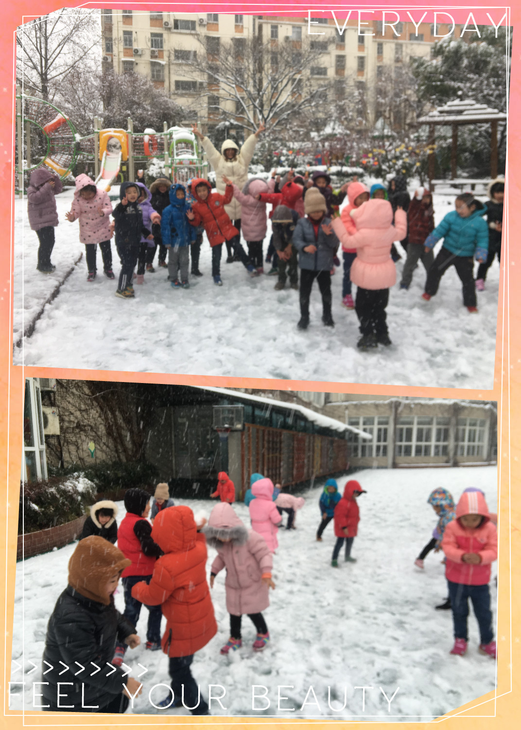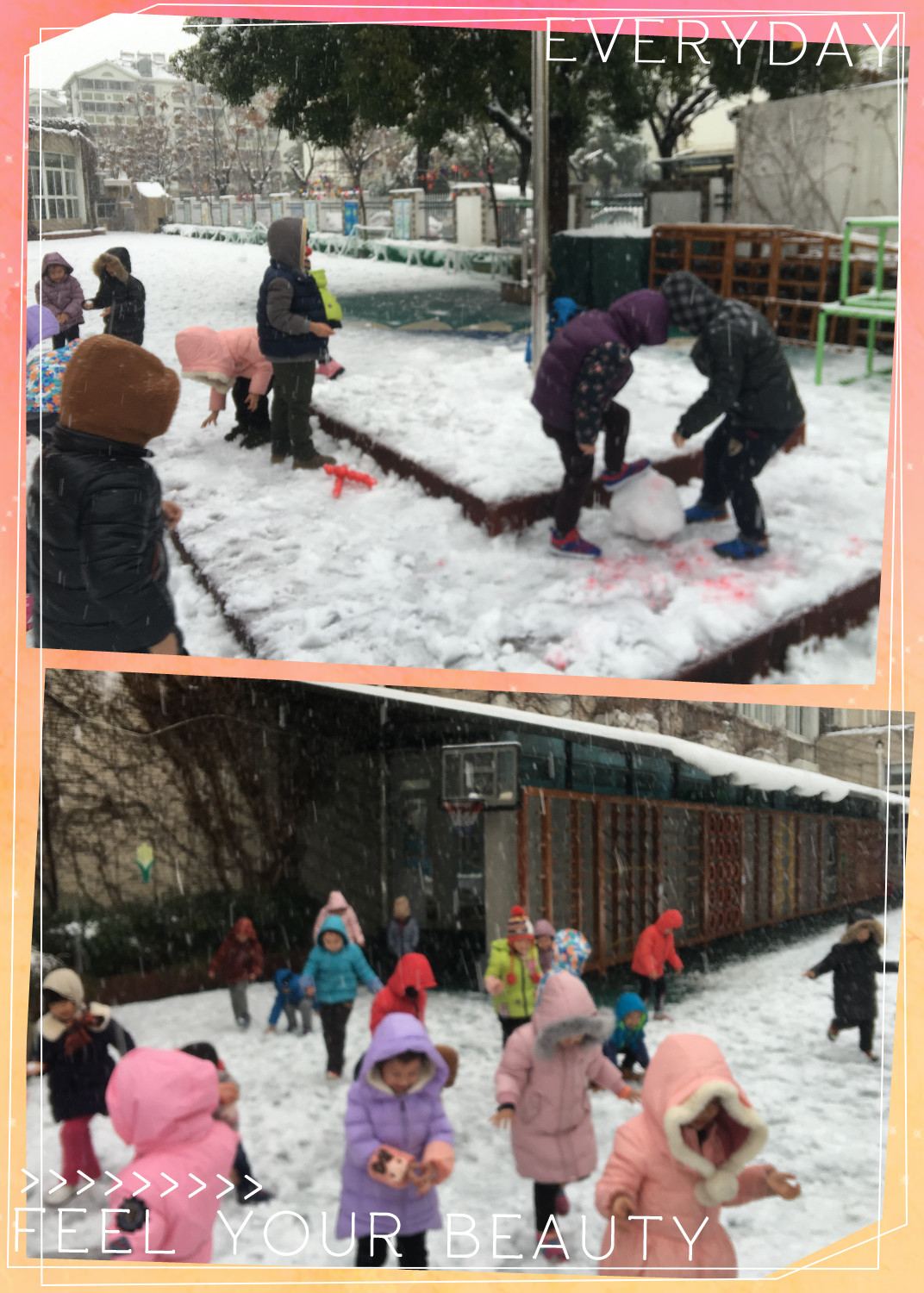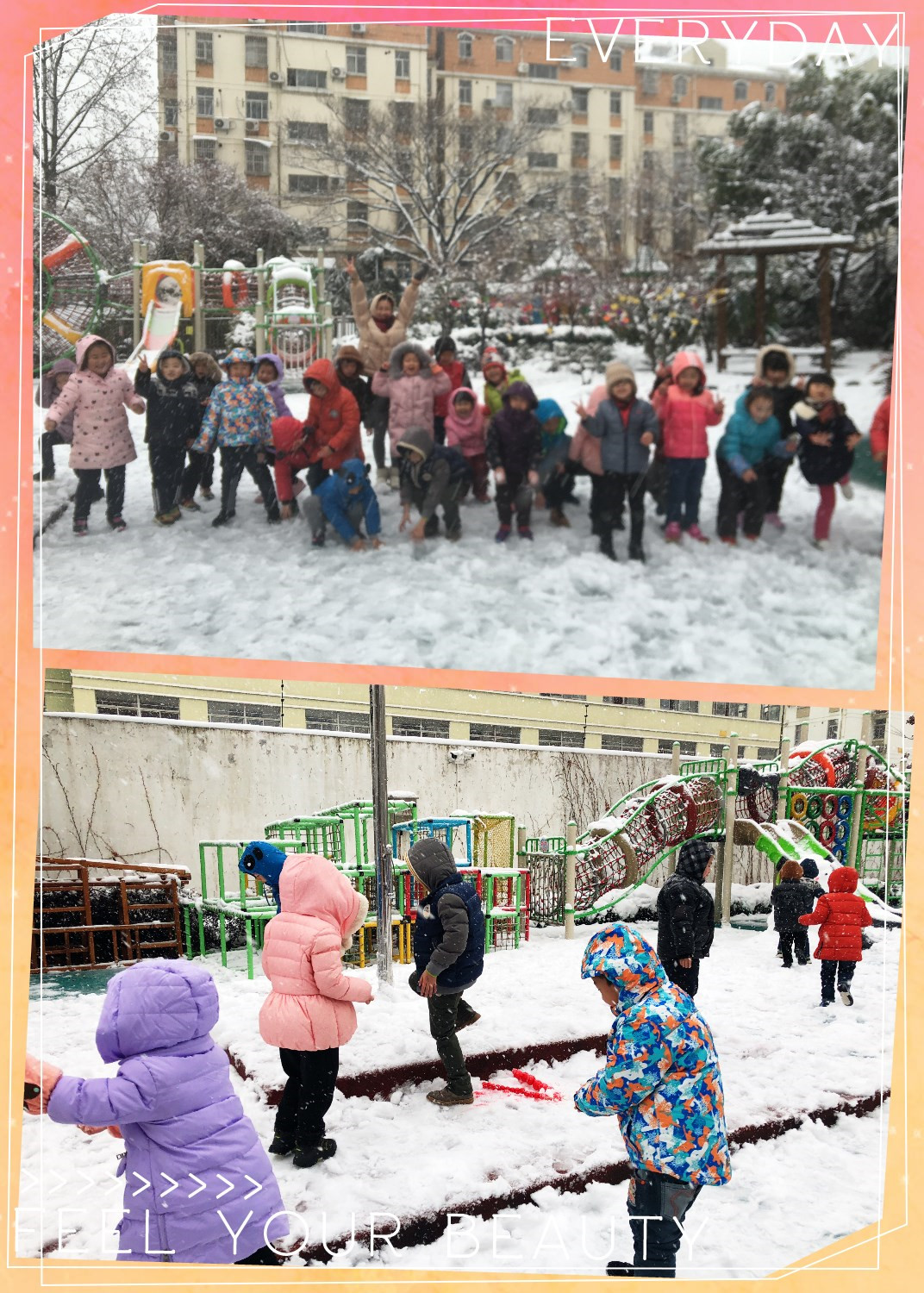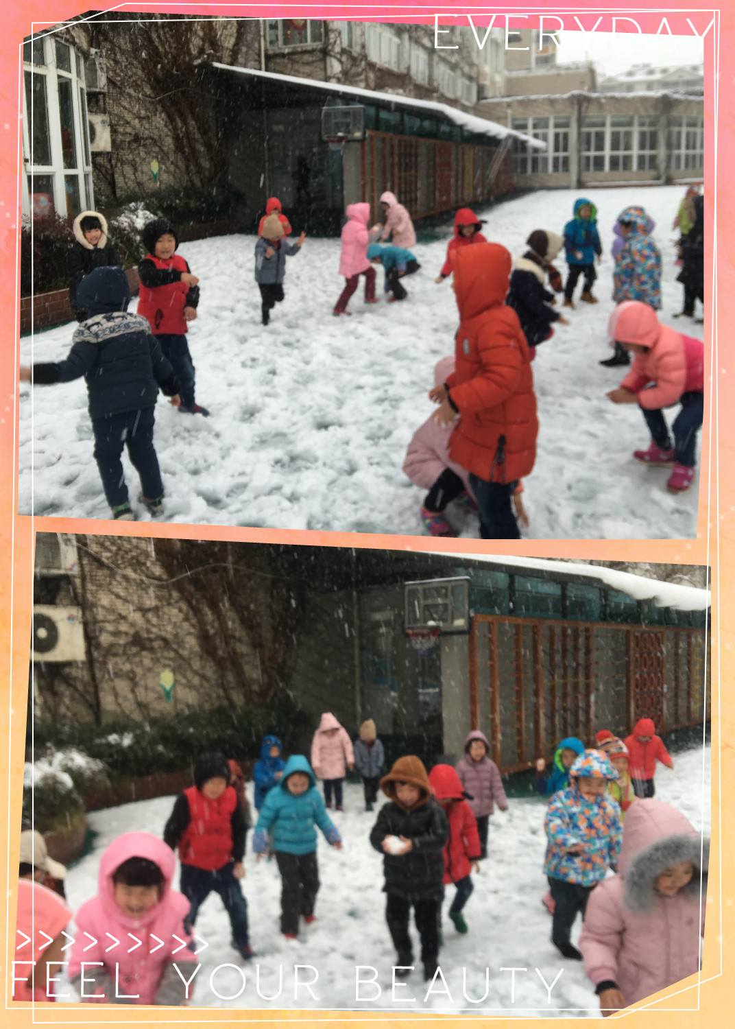 终于下雪啦!幼儿园变得白茫茫的,小朋友们带好帽子来打雪仗啦!