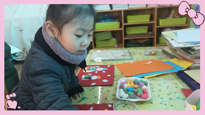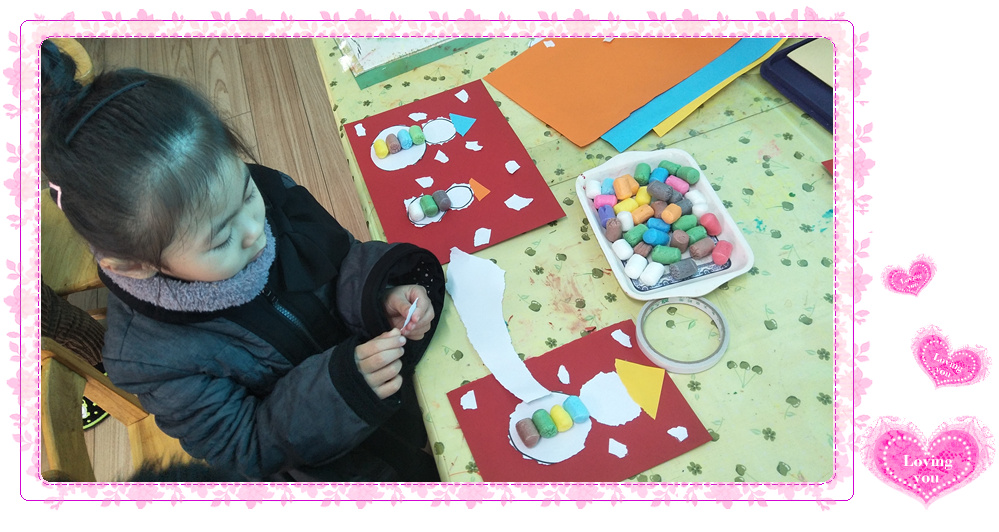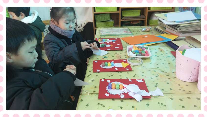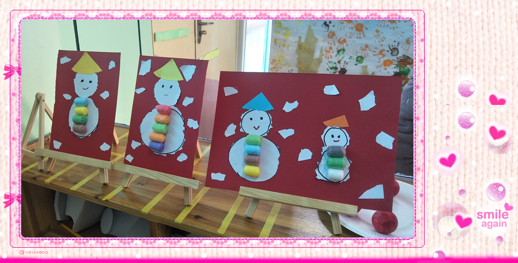“冬天到,雪花飘,我们快来做雪人。”我们在老师的帮助下用小手把纸撕出了小雪人圆圆的脑袋和大大的身体,还给他“戴上”了漂亮的帽子、围巾和手套,这样小雪人也不怕冷了。