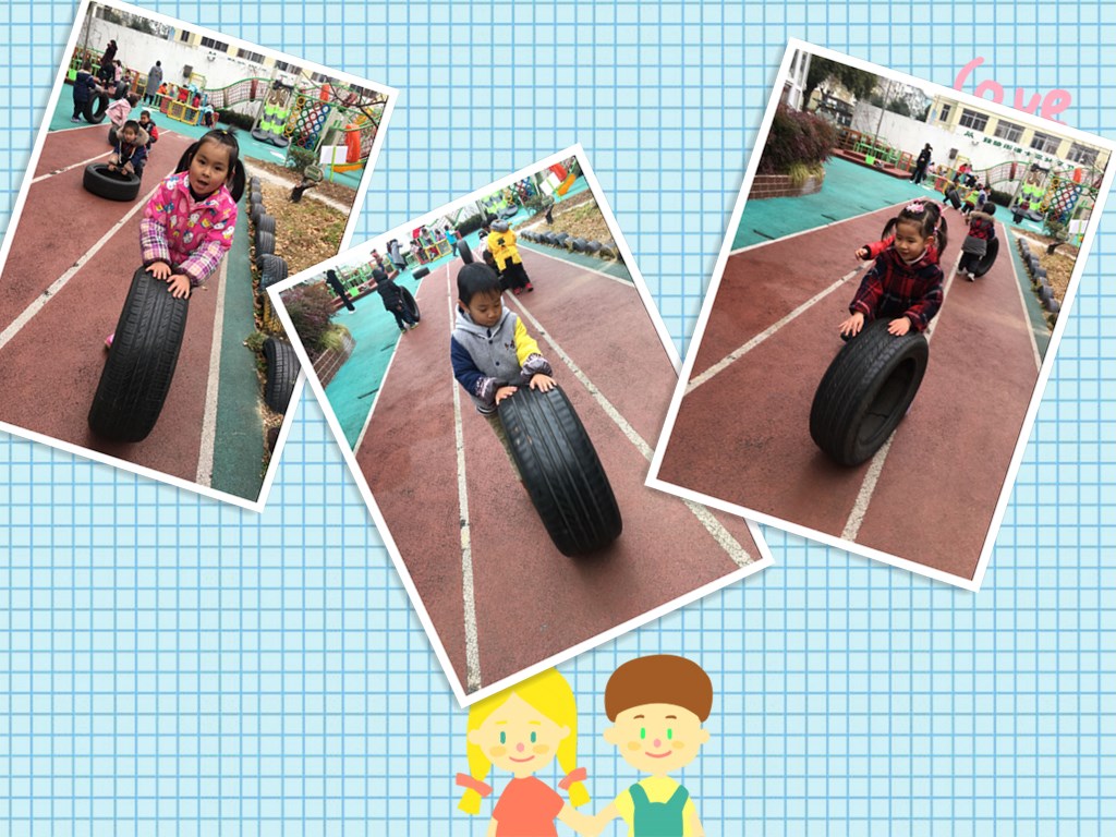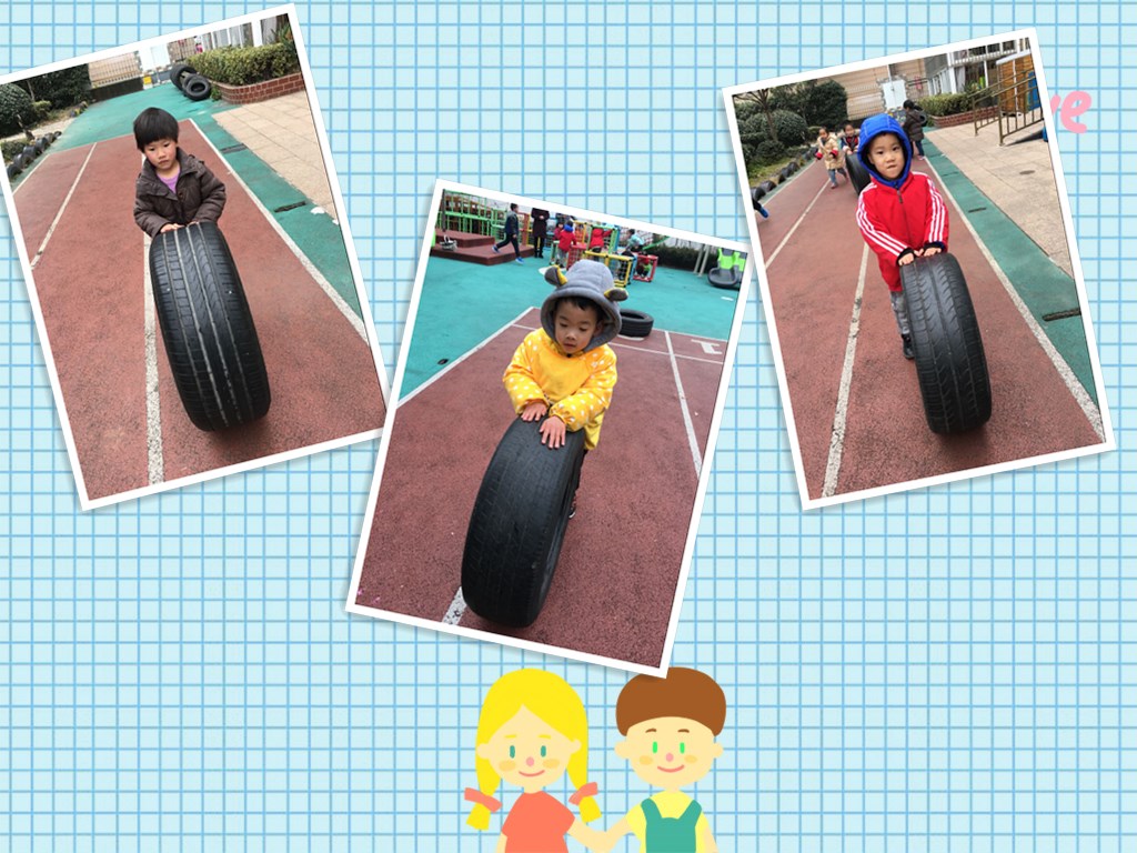 我们现在可以把大大地轮胎滚动起来,我们在滚动轮胎时要注意保持平衡,这样才能把轮胎滚得远远地,滚动轮胎不仅仅可以让我们的身体暖起来,而且会让我们的手臂更加的有力量哦!