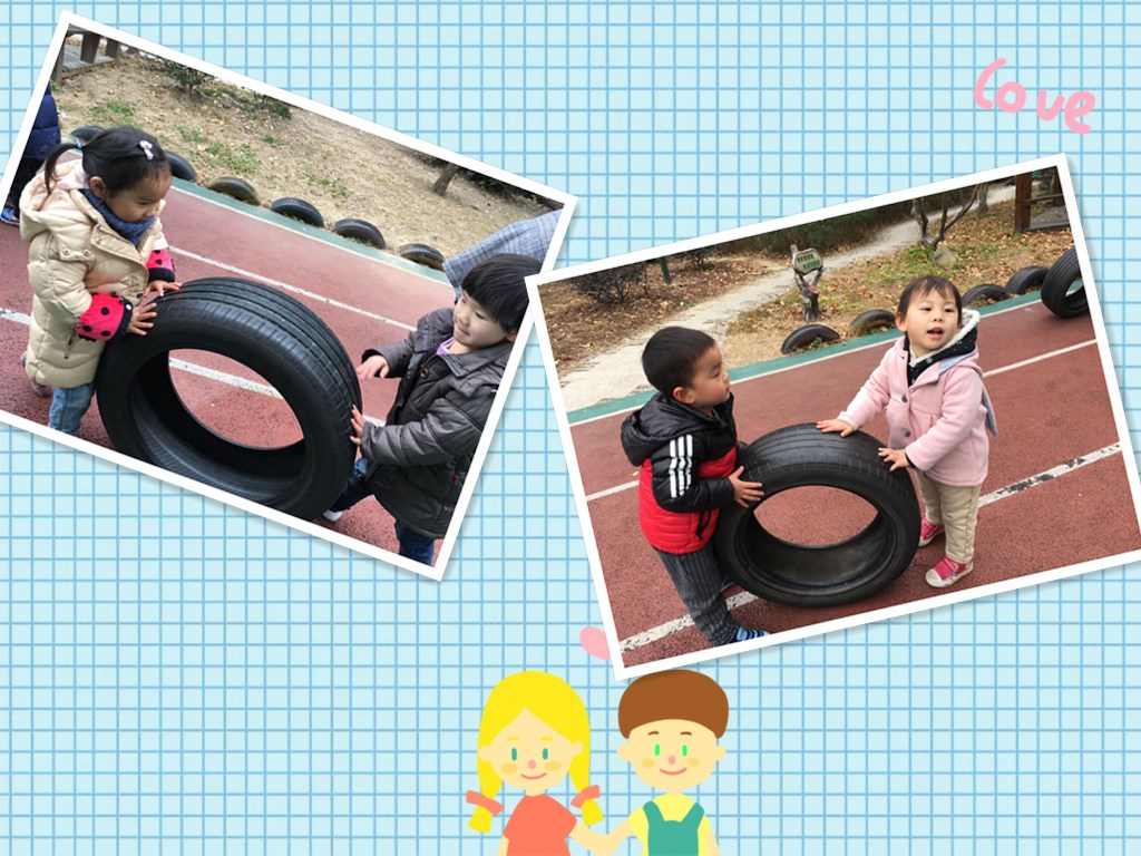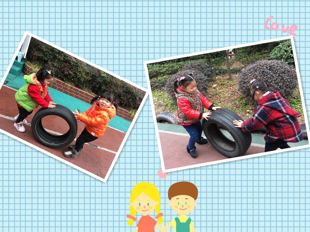 轮胎有许多的玩法,可以自己一个人玩,也可以和好朋友相互分享、相互合作,分享玩具。你看,我们可以一起把轮胎滚得远远地,我们一个在前面,一个在外面,配合得多好啊,轮胎还有更多的玩法,我们会慢慢发现的。