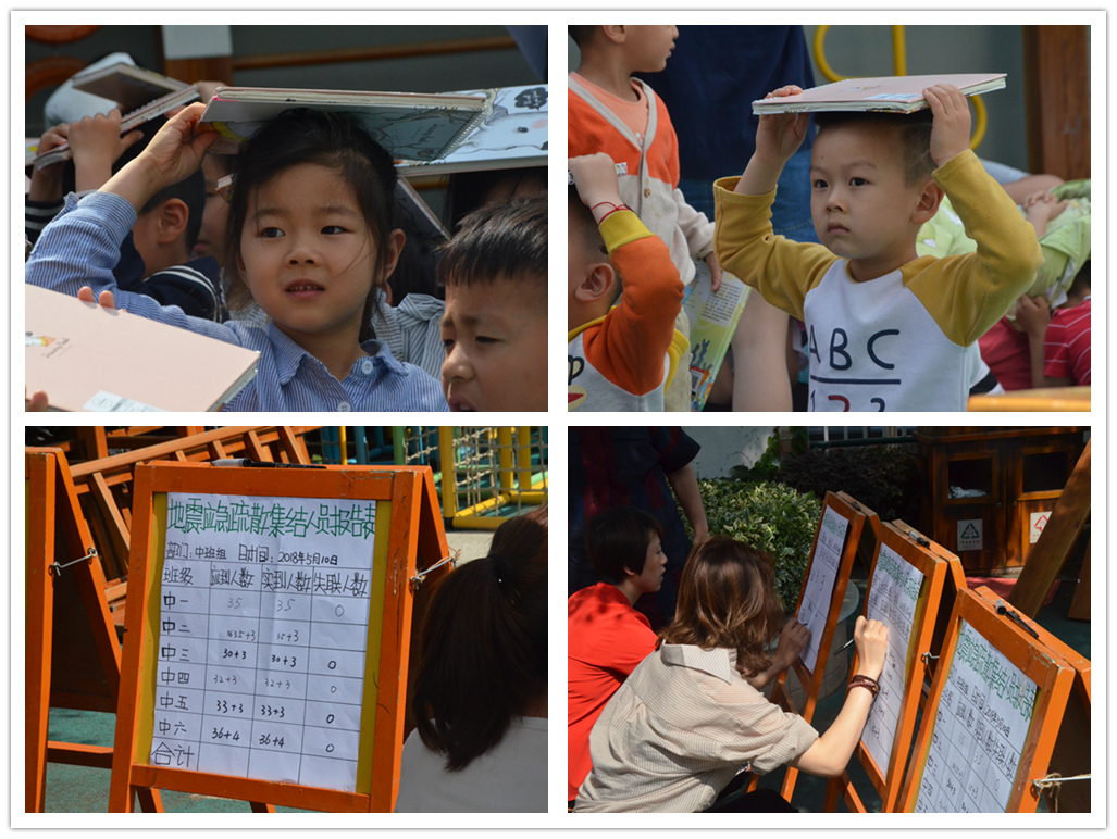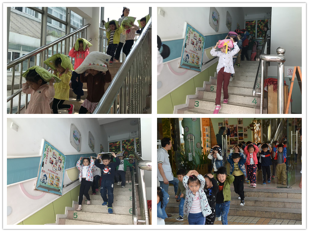 此次演练活动分为两部分,第一部分演练是 “室内避险”,当防空警报拉响,孩子们在老师的指导下,纷纷双手护头,躲到桌下或墙角处,还有的孩子们跟着教师躲避在盥洗室,静静地等待着地震的平息。第二部分演练是“室外疏散”,警报声再次响起老师带领幼儿用身边随手枕头从指定疏散通道撤离危至大操场,到达目的地后,各班老师立即清点人数并向园长汇报。在3分钟之内,我园595名幼儿,81位教职员工全部撤离,未出现失联和伤亡情况。