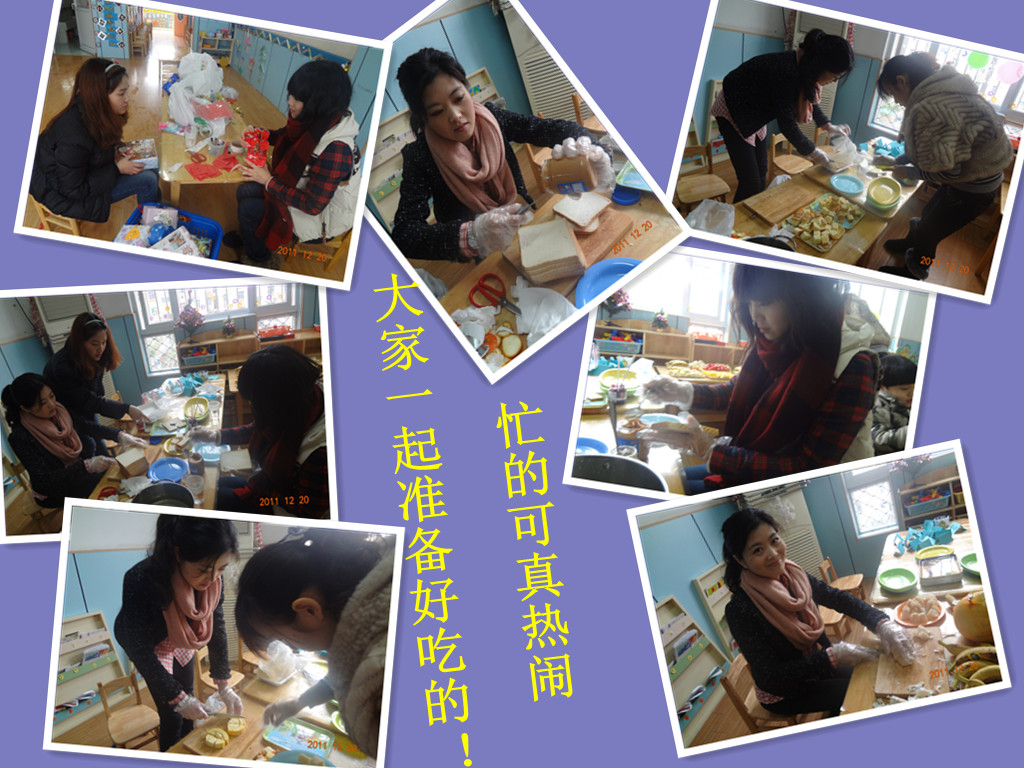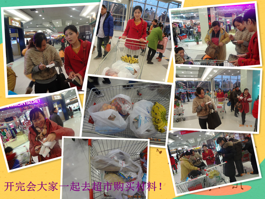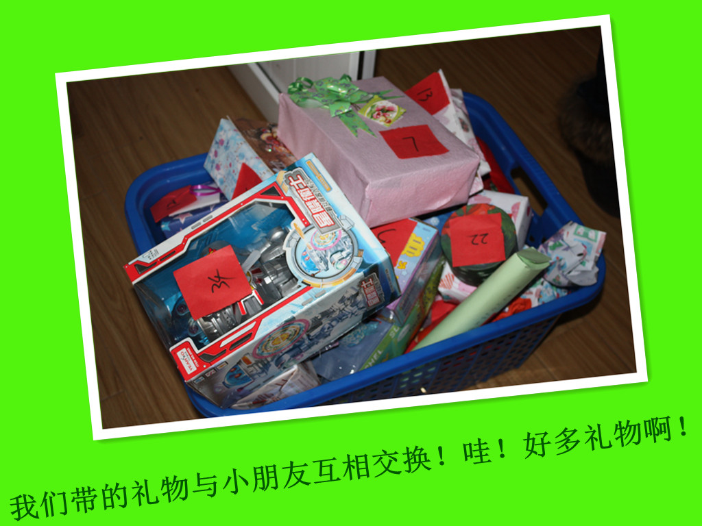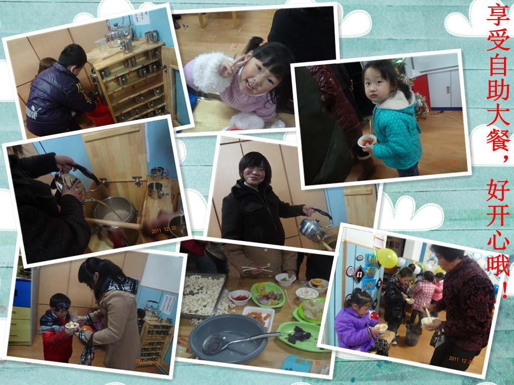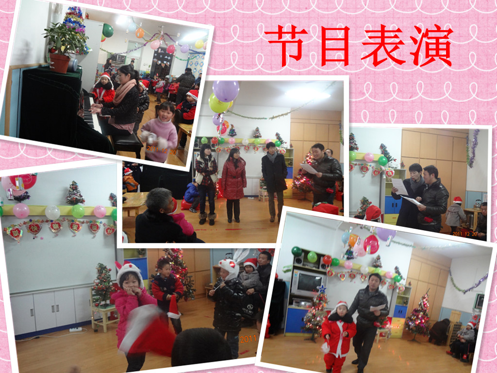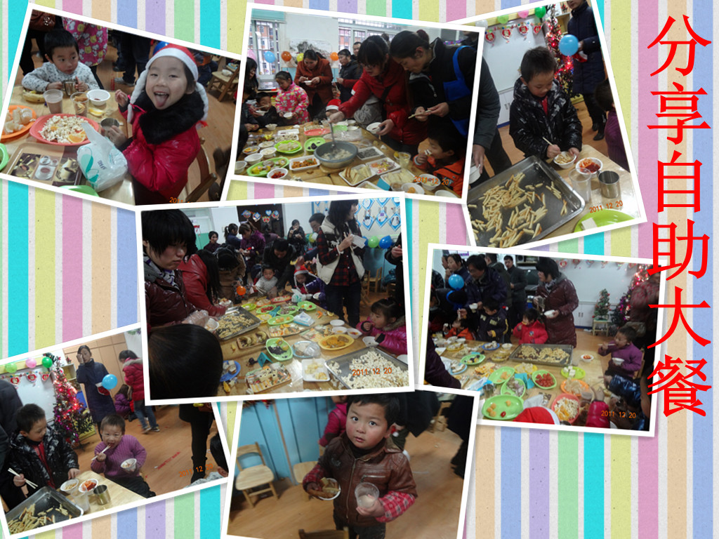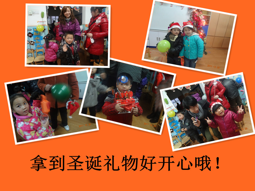 2011年12月20日,这是一个快乐的日子!今天我们班将举行庆圣诞迎新年的亲子活动,全班38名小朋友都参加了本次活动!每个人都带了一份礼物,我们互相交换了礼物!而且还有精彩的节目与几十种美食自助餐!哈哈!又好吃又好玩!