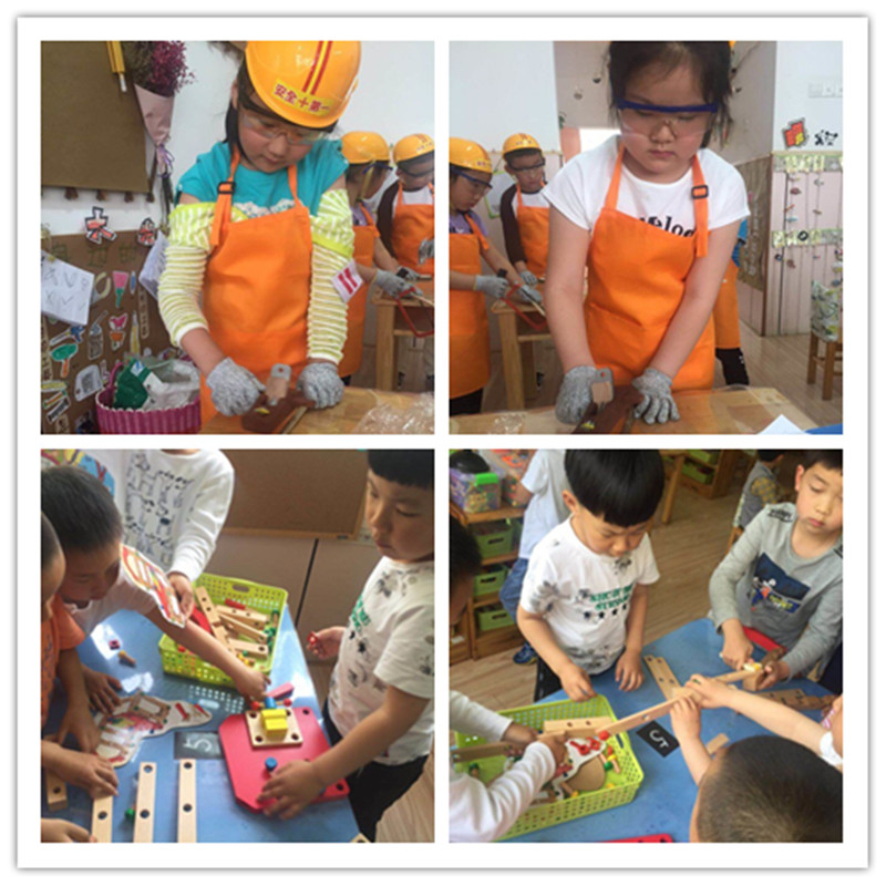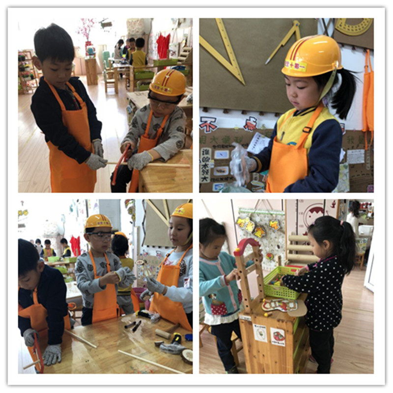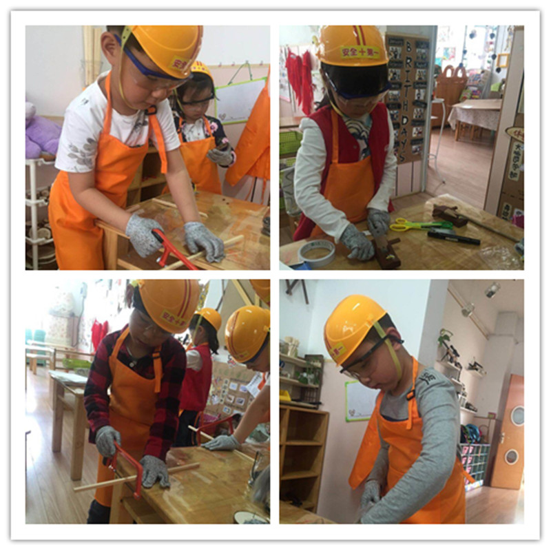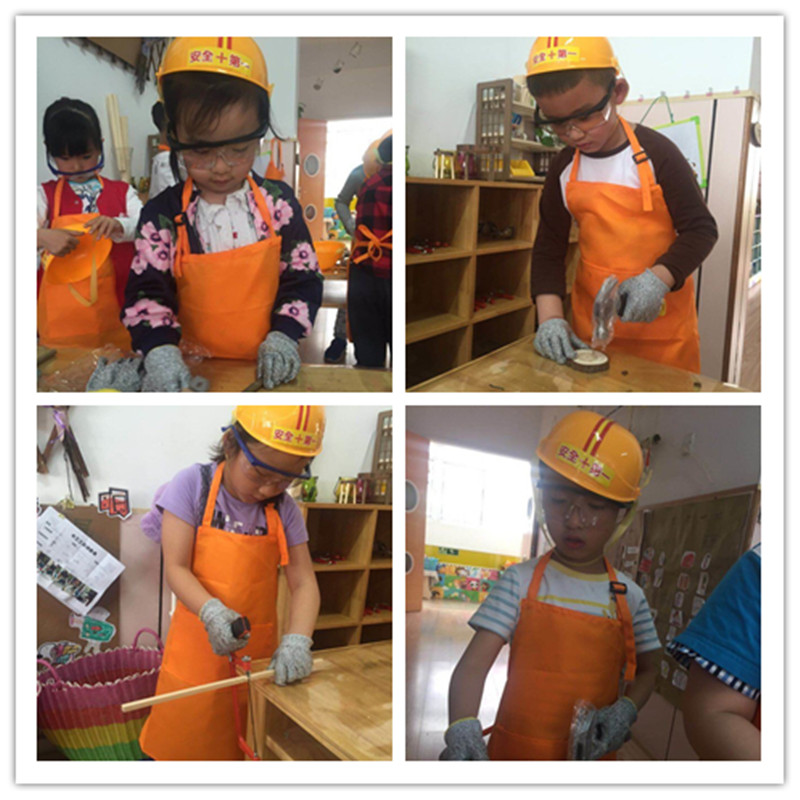 本周我们开展了木工园的活动,小朋友们都积极扮演建筑工人,戴上安全帽和手套等保护工具,拿起了锯子、锤子,进行了锯木头、钉钉子等木工制作活动。通过这项活动,小朋友们对工具、材料等有了更深刻的了解和认识,同时也感受了生活并通过活动挑战自己的运动技能。