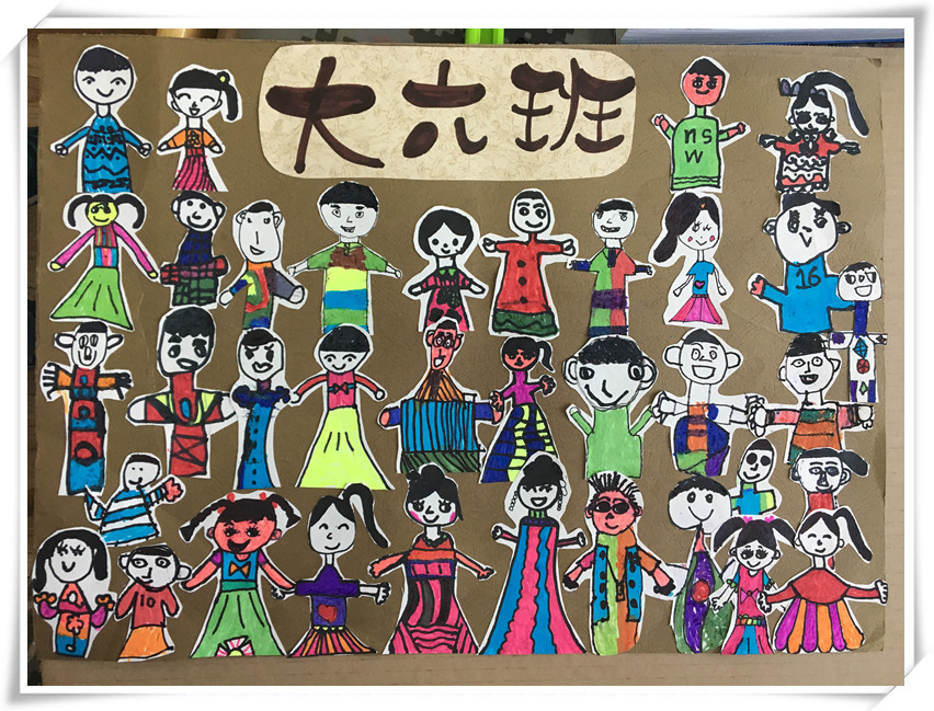 “我的头发是长长的,扎成两个小辫子。”“我的发型是扎成一束马尾巴。”“我的脸是圆圆的,眼睛也是圆圆的。”“我笑起来的时候眼睛是眯起来的。”小朋友们一边画一边自言自语,把自己的特点用画笔在纸上表现出来。当小朋友们把自画像沿轮廓剪好粘贴在一起时,一幅手绘毕业照就大功告成了。小朋友们站在毕业照前根据画像的特点很快找出了同伴们的身影。