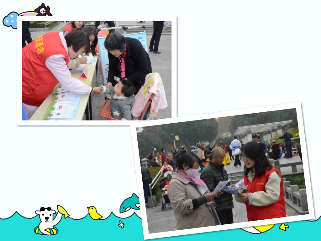 2018年12月1日上午,南京市建邺区水西门大街和平广场上,来自各高校与社区单位的青年志愿者们在此集结,开展“七彩志愿社区行” 第六期的社区服务活动,翠屏山幼儿园的志愿者老师们积极响应江苏省志愿者协会的组织号召,为本次的志愿服务活动积极筹备,将“0~8岁幼儿卫生保健”等相关常识与“如何预防儿童冬季常见传染病”的疾病防控方法,对周边社区居民进行幼儿保健知识的辐射。