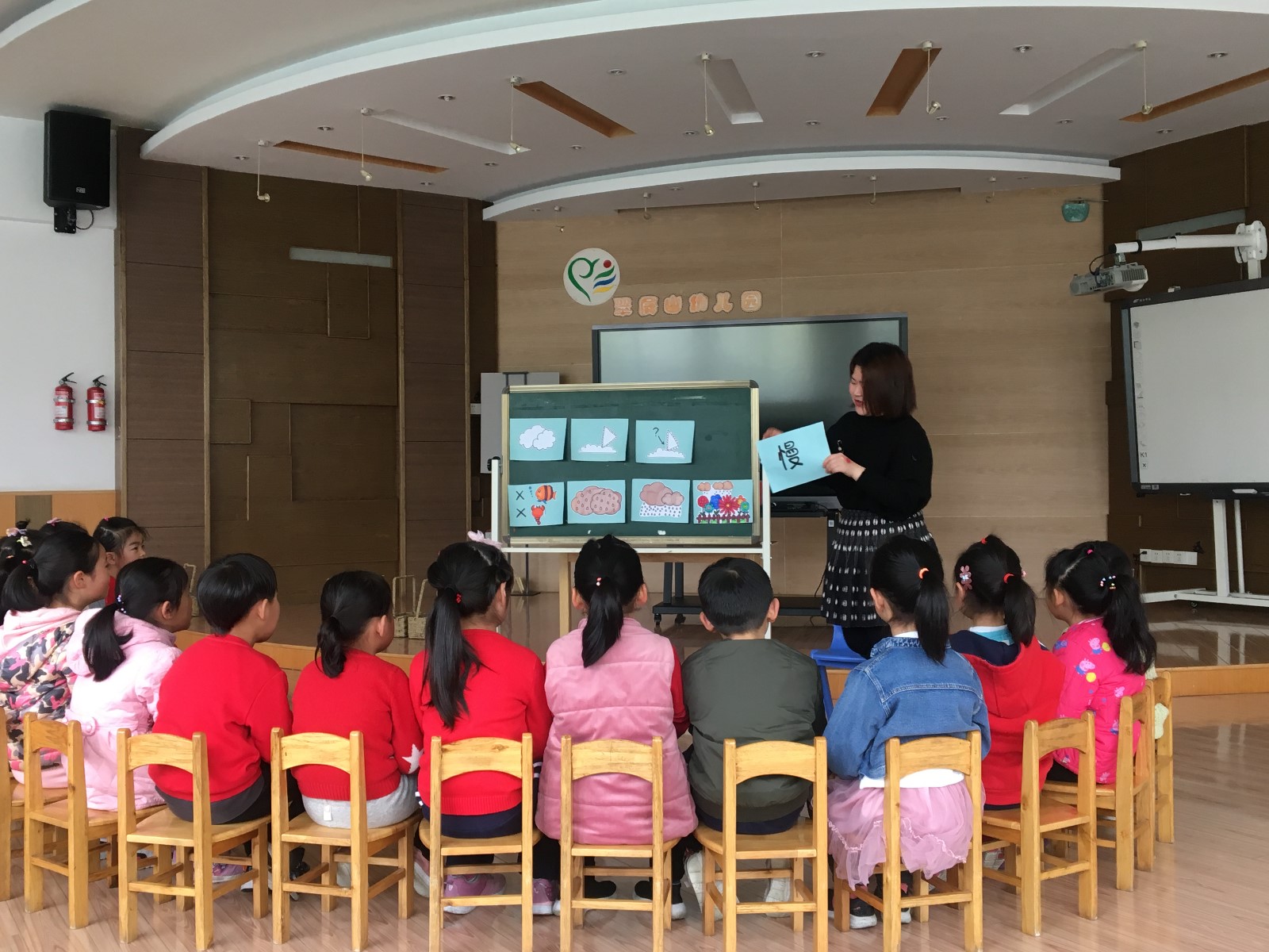 “蓝天蓝,白云白,好像海里飘帆船…”,小小的白云像什么?在悠扬的歌声中,孩子们静静的感受着歌曲《小白船》的意境,“白云还像什么?”袁梦靖老师用提问的方式启迪孩子,让孩子们拓宽思维,发挥自己的想象力,用优美的生音唱出了自己的答案。