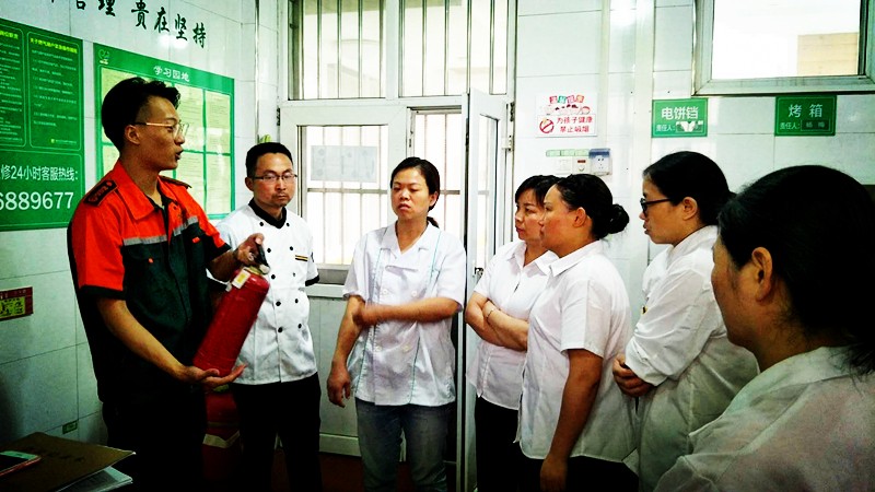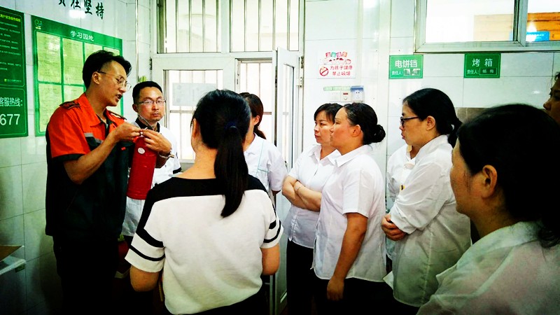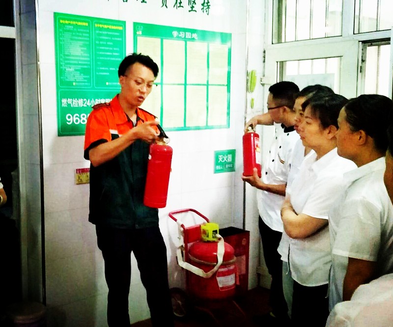 第二环节是开展灭火演练活动。陈教官就消防器材的使用等对食堂人员进行了示范指导。在现场互动交流中,每位食堂人员仔细聆听要领、观察细节,并纷纷参与,进行了实际操作演练。陈教官不断地讲解和纠正,提醒站立的位置和距离及双手握皮管和手柄的位置,让大家真正掌握了使用灭火器的正确方法。通过操作与观察,大家更深入地了解了灭火器的灭火步骤是“一看二摇三拔四喷”,知道人要站在上风口,由远而近,对准火焰根部扫射。陈教官告知大家,在发现火灾时要保持镇静,知道火势较小或较大时的应急处理办法。在交流互动中,大家掌握了使用天然气的注意事项和油锅着火的处理办法等,知道了“人走电断”,每天下班时都要检查食堂的电器是否断电,天燃气总阀门是否关闭。