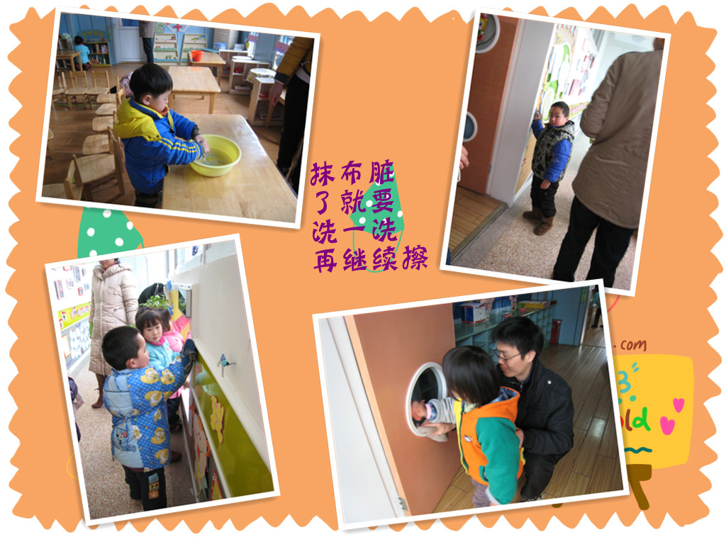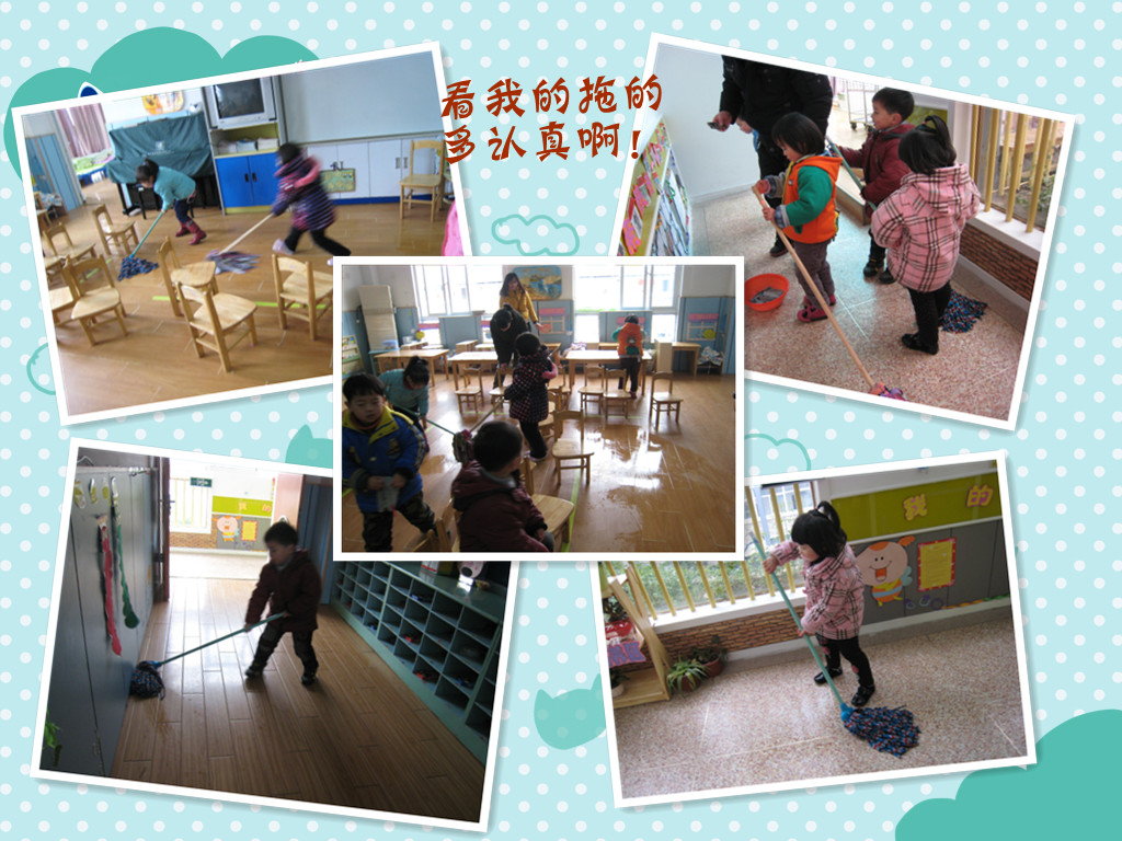 哇,看看宝宝们拿着抹布,拿着拖把,还真的很有范儿呢!