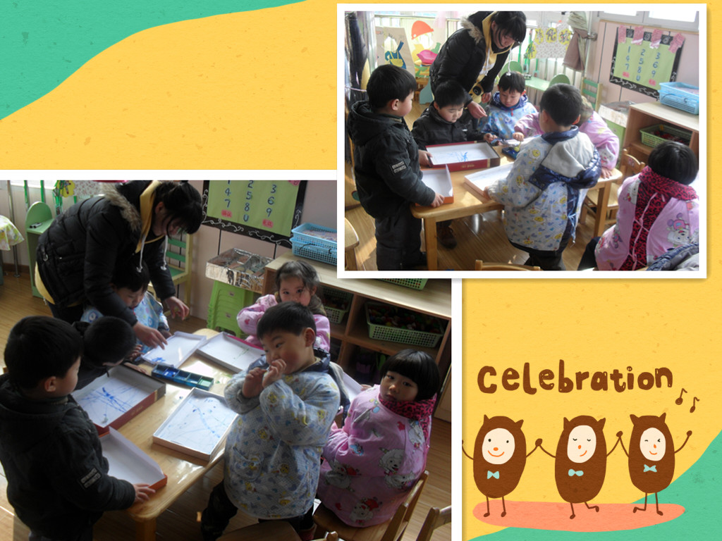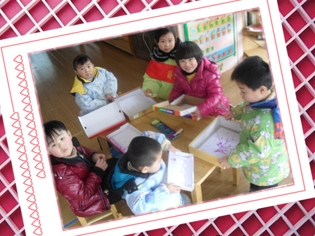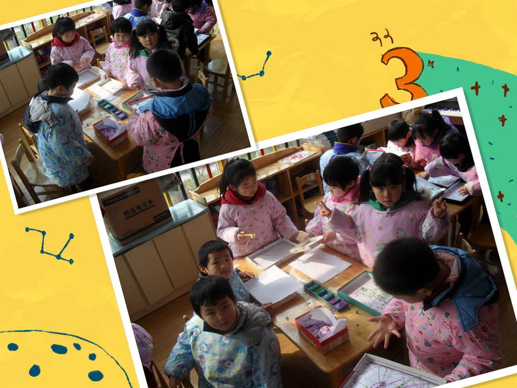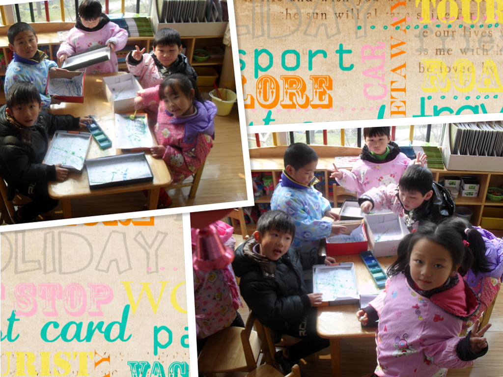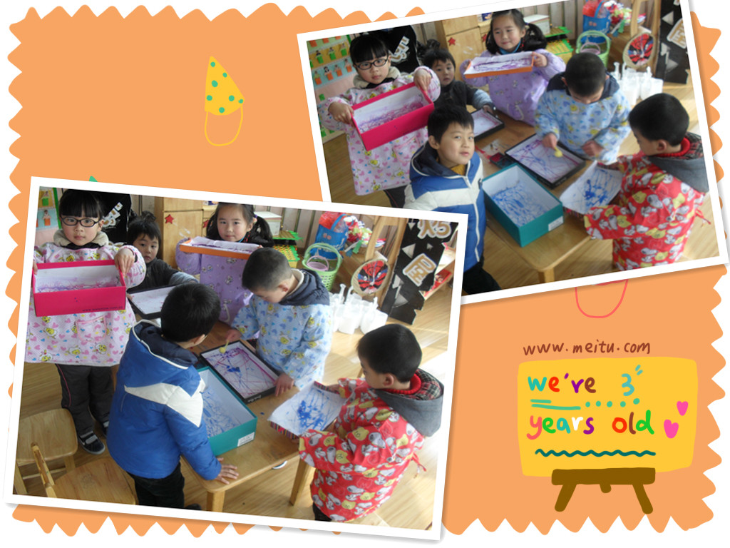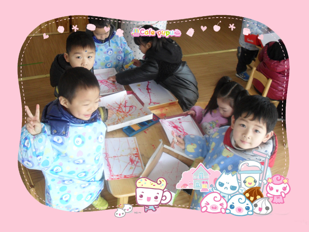 (一):孩子们使用弹珠、颜料、鞋盒、勺子等几种工具进行弹珠滚画。瞧,他们玩的多起劲啊!