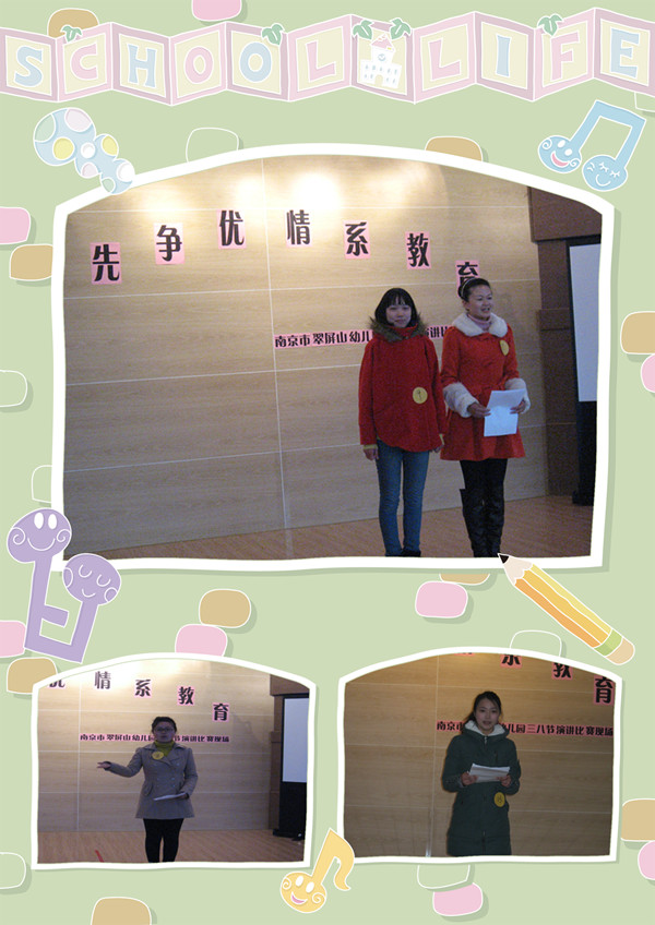 在“三八”国际劳动妇女节时期,我园举行了“争先创优 情系教育”演讲比赛。该园的四十多名教师代表用她们亲身的经历、真实的情感、质朴的语言,声情并茂的讲述着工作中的酸甜苦辣,展现了翠幼女教师的巾帼风采。